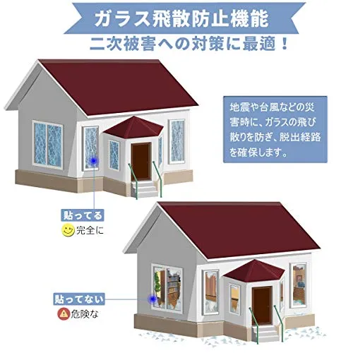 【ガラス破片飛散防止機能】窓ガラスフィルム貼り付けると、台風や地震など発生する際、窓ガラスが割れても破片が飛び散らない! 割れたガラス破片による二次災害と思わぬ怪我を防ぐ事ができます。また普段は不注意でガラス表面の擦り傷も防止できます。