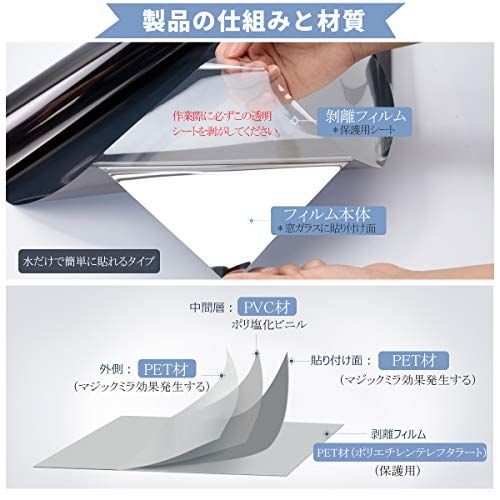 【目隠し機能】昼間は外から見ると鏡のように人影を映す同時に、高い目隠し効果を生かします。室内から見ると、紺色の透明シートに見え、視界を損なわず、気軽に外の風景を眺めます。一般家庭のガラス窓、オフィス、会議室、事務室などの目隠し装飾に非常に適用しています。