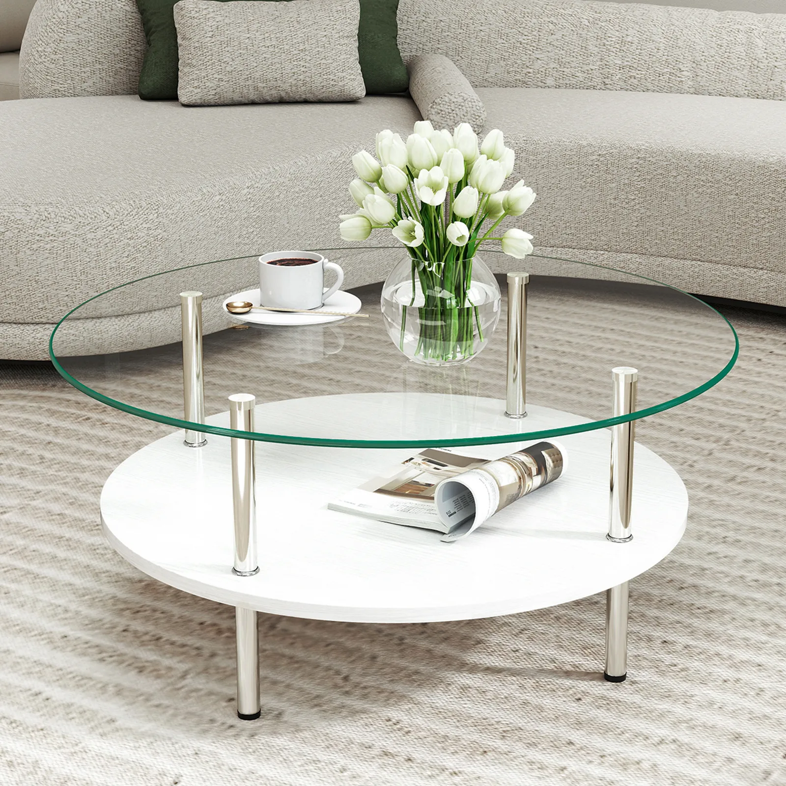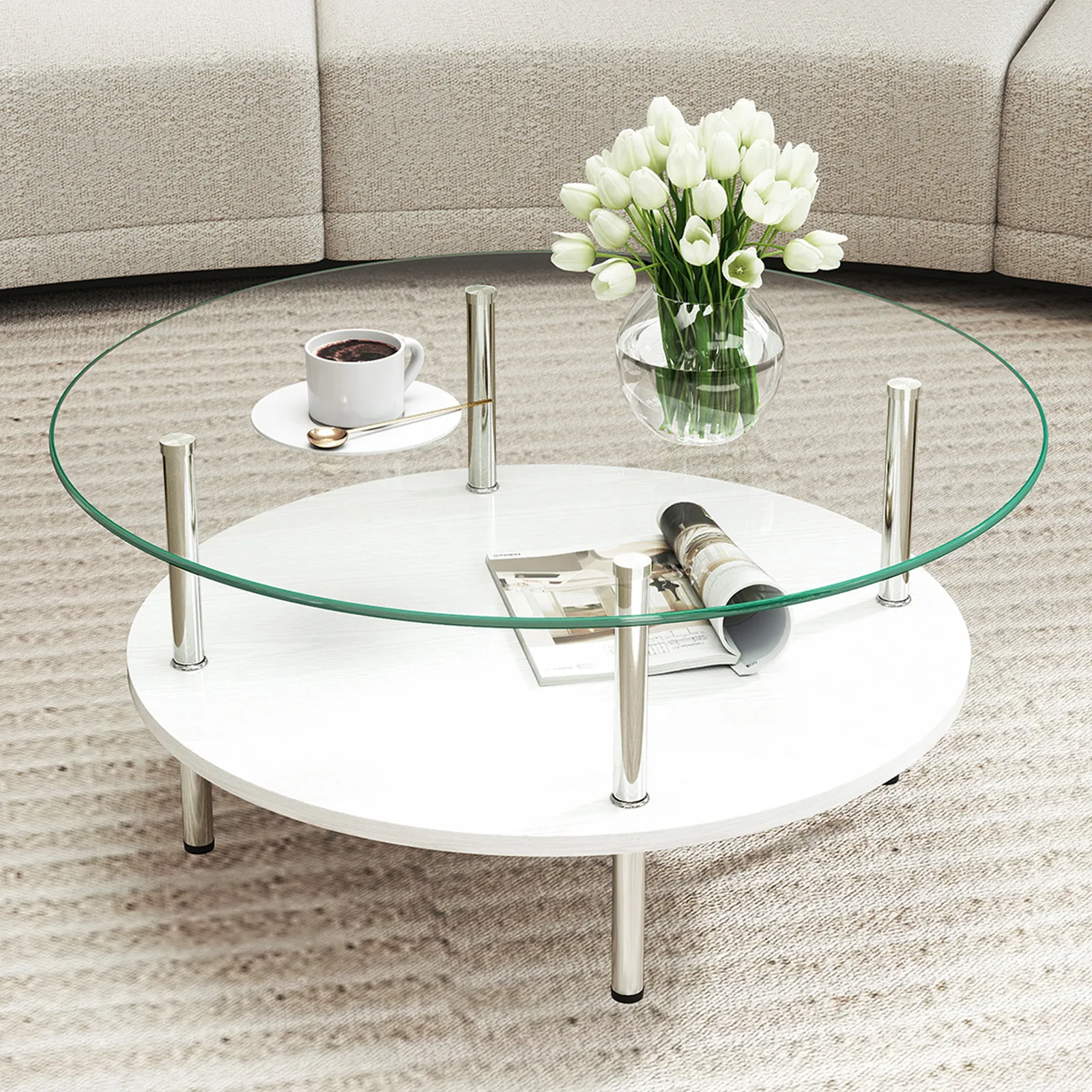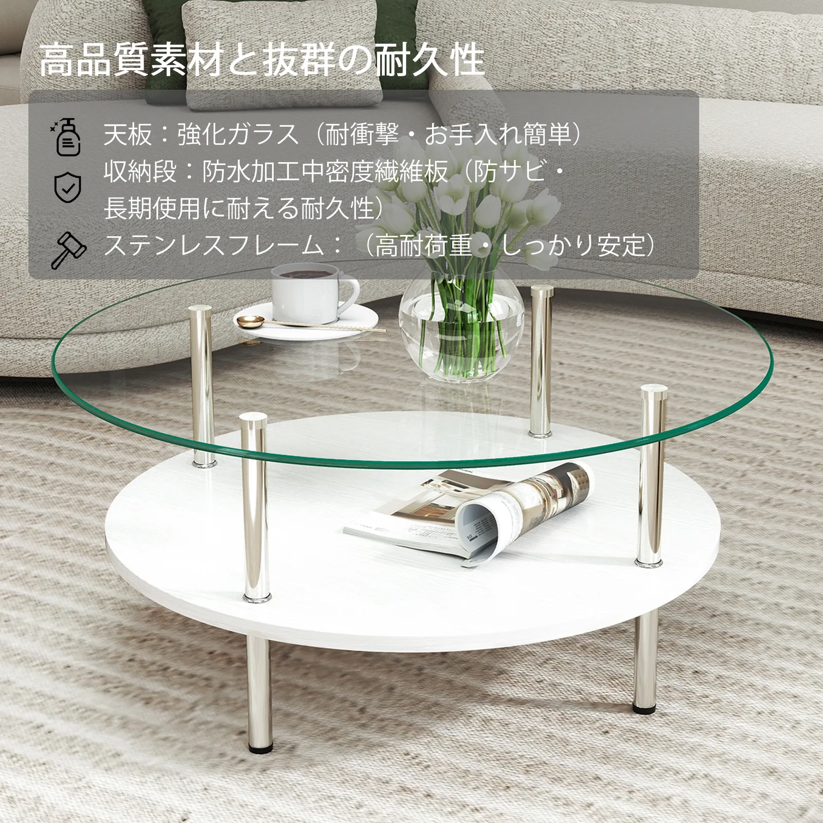 【大容量2段収納】便利な2段構造で、上段には日用品、下段には雑誌やリモコンなどをすっきり収納できます。リビングをいつも整った状態に保ち、スマートで快適な空間を作ります。
