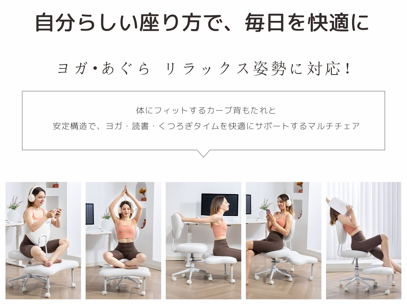 【自分らしい座り方で、毎日を快適に】体にフィットするカーブ背もたれと安定構造で、ヨガ・読書・くつろぎタイムを快適にサポートするマルチチェア