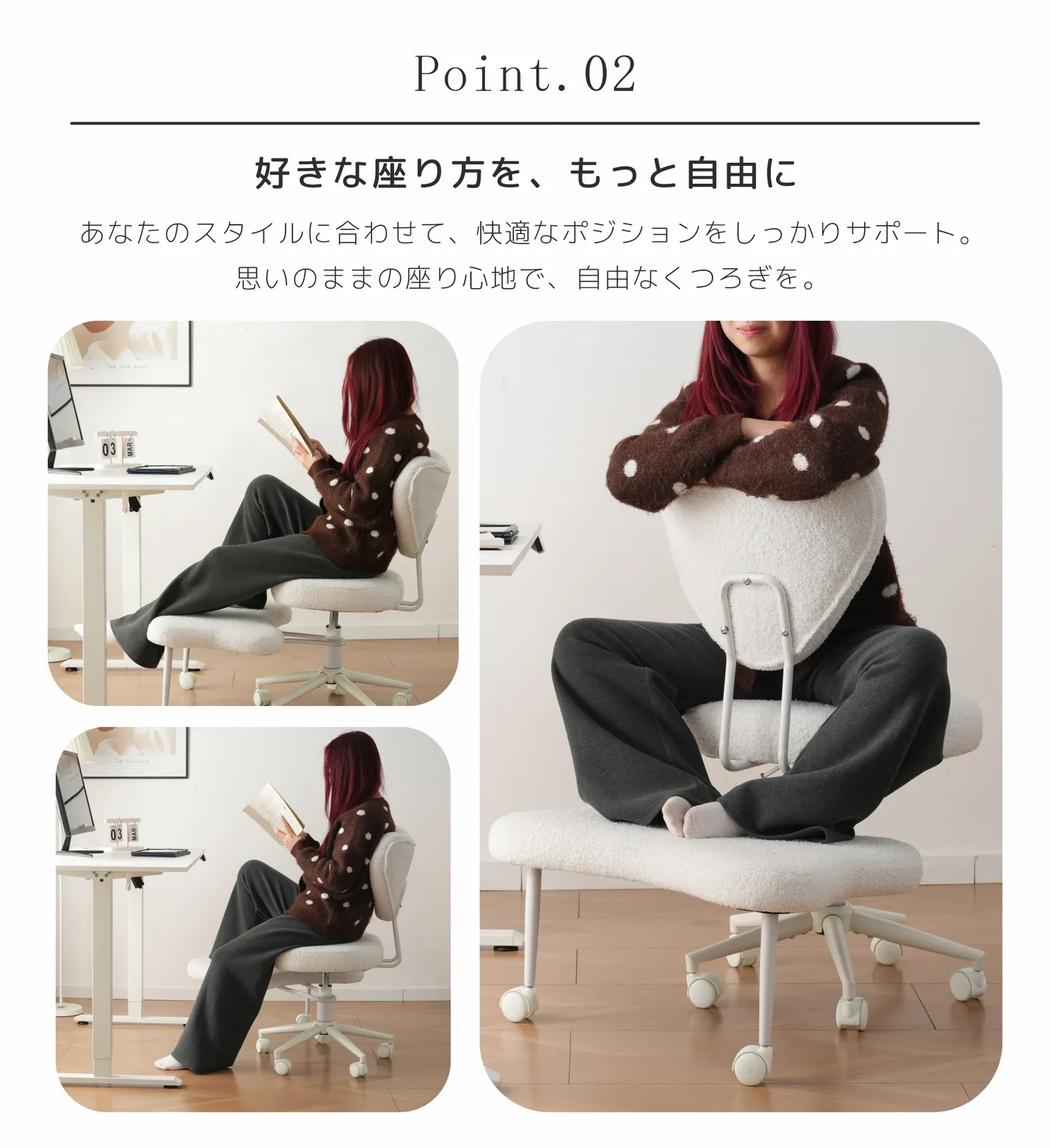 【好きな座り方を、もっと自由に】あなたのスタイルに合わせて、快適なポジションをしっかりサポート。思いのままの座り心地で、自由なくつろぎを。