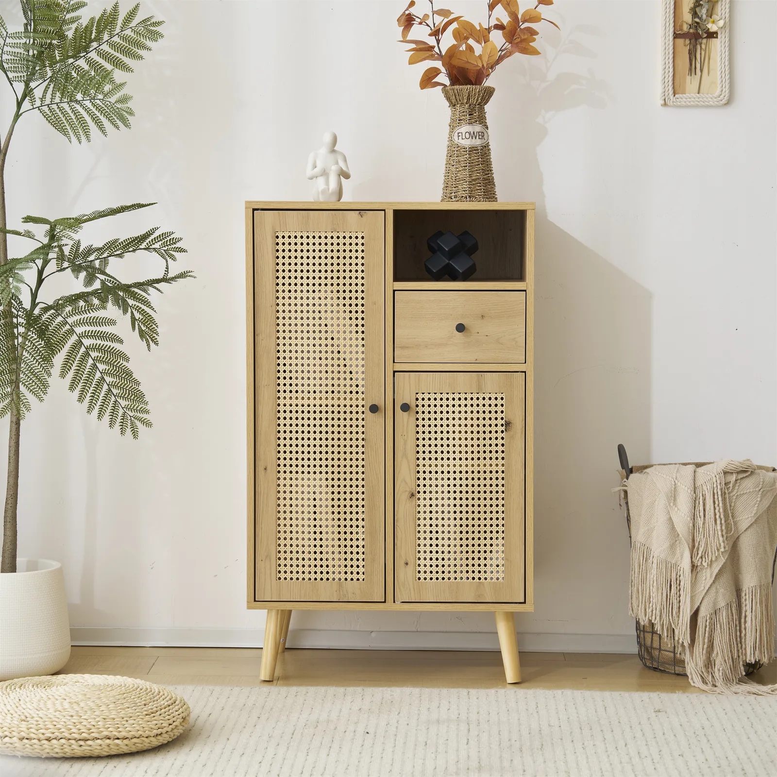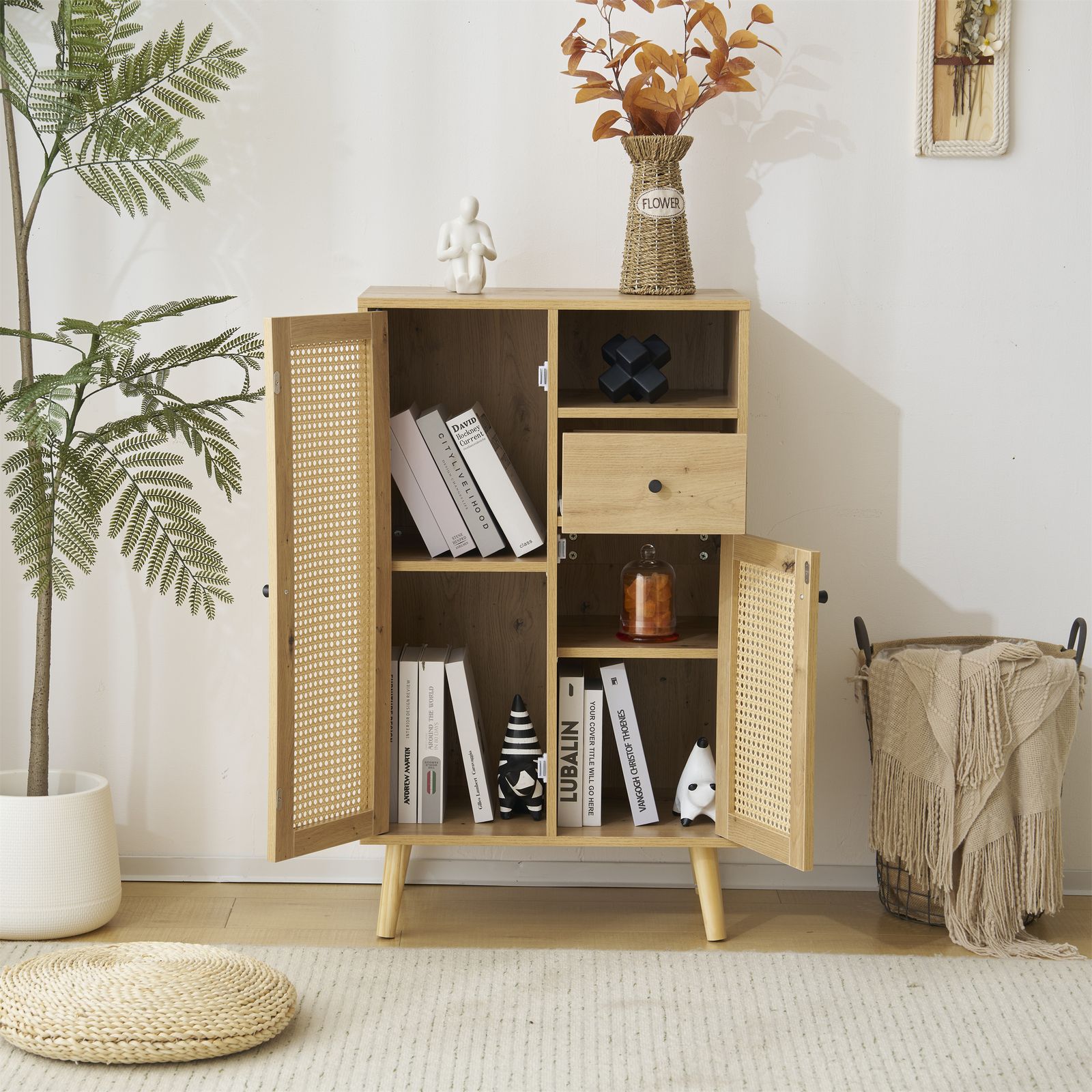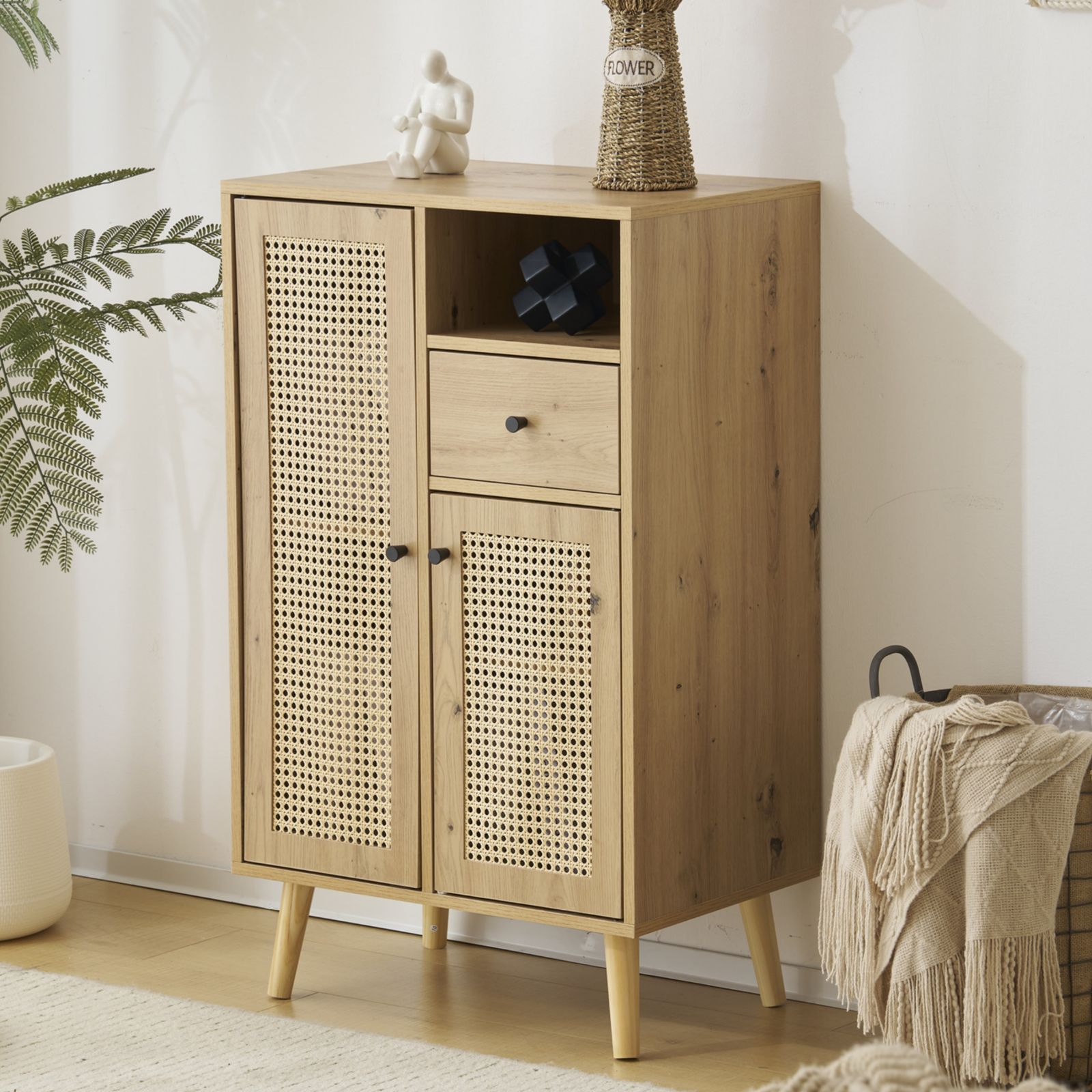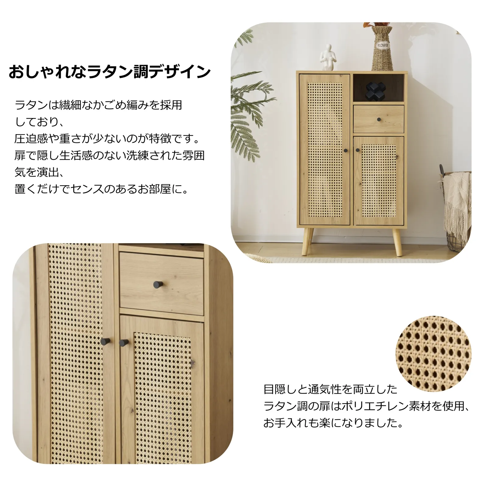 【おしゃれなラタン調デザイン】ラタンは繊細なかごめ編みを採用しており、圧迫感や重さが少ないのが特徴です。扉で隠し生活感のない洗練された雰囲気を演出、置くだけでセンスのあるお部屋に。目隠しと通気性を両立したラタン調の扉はポリエチレン素材を使用、お手入れも楽になりました。