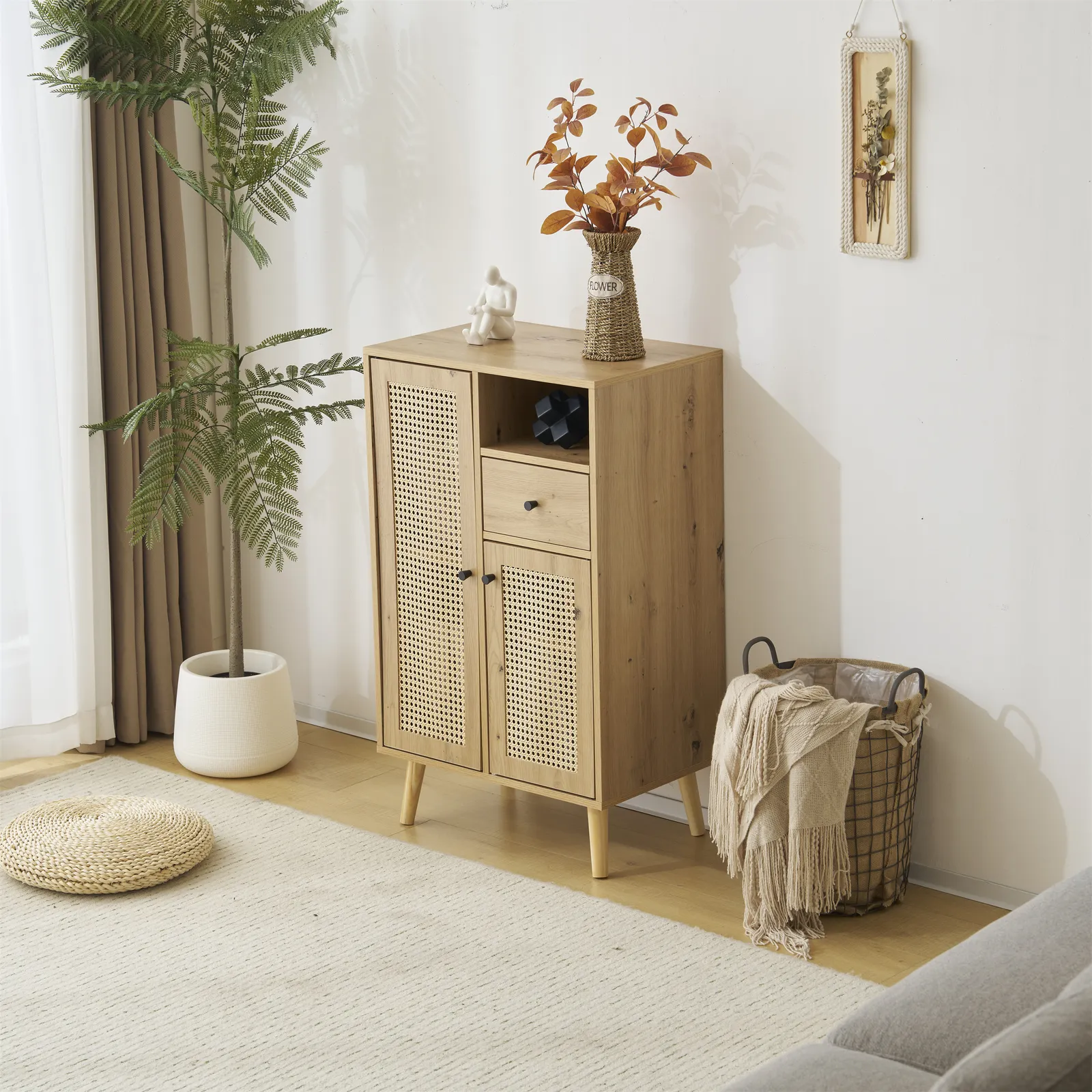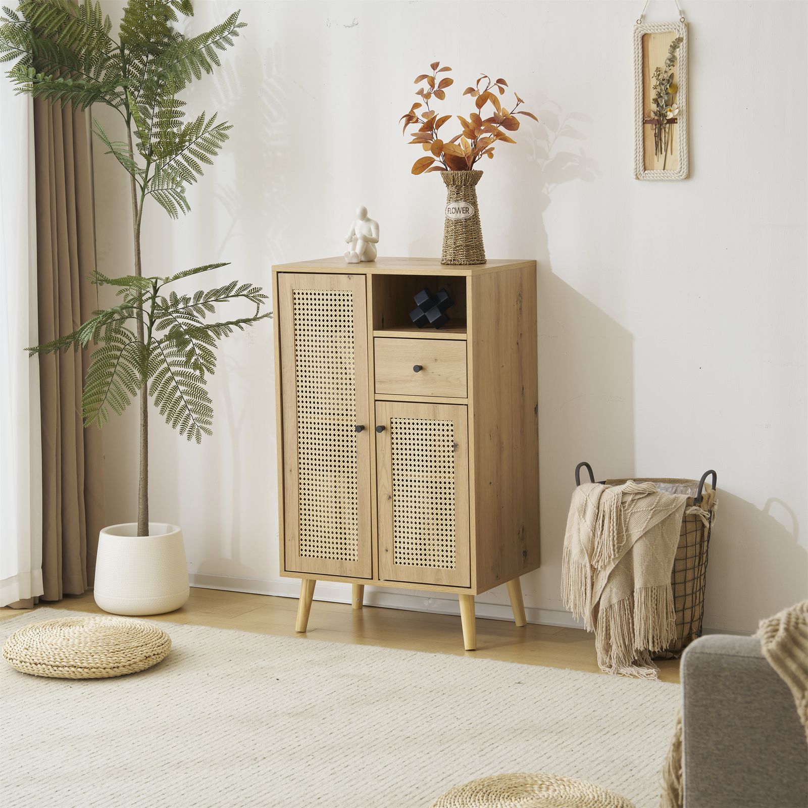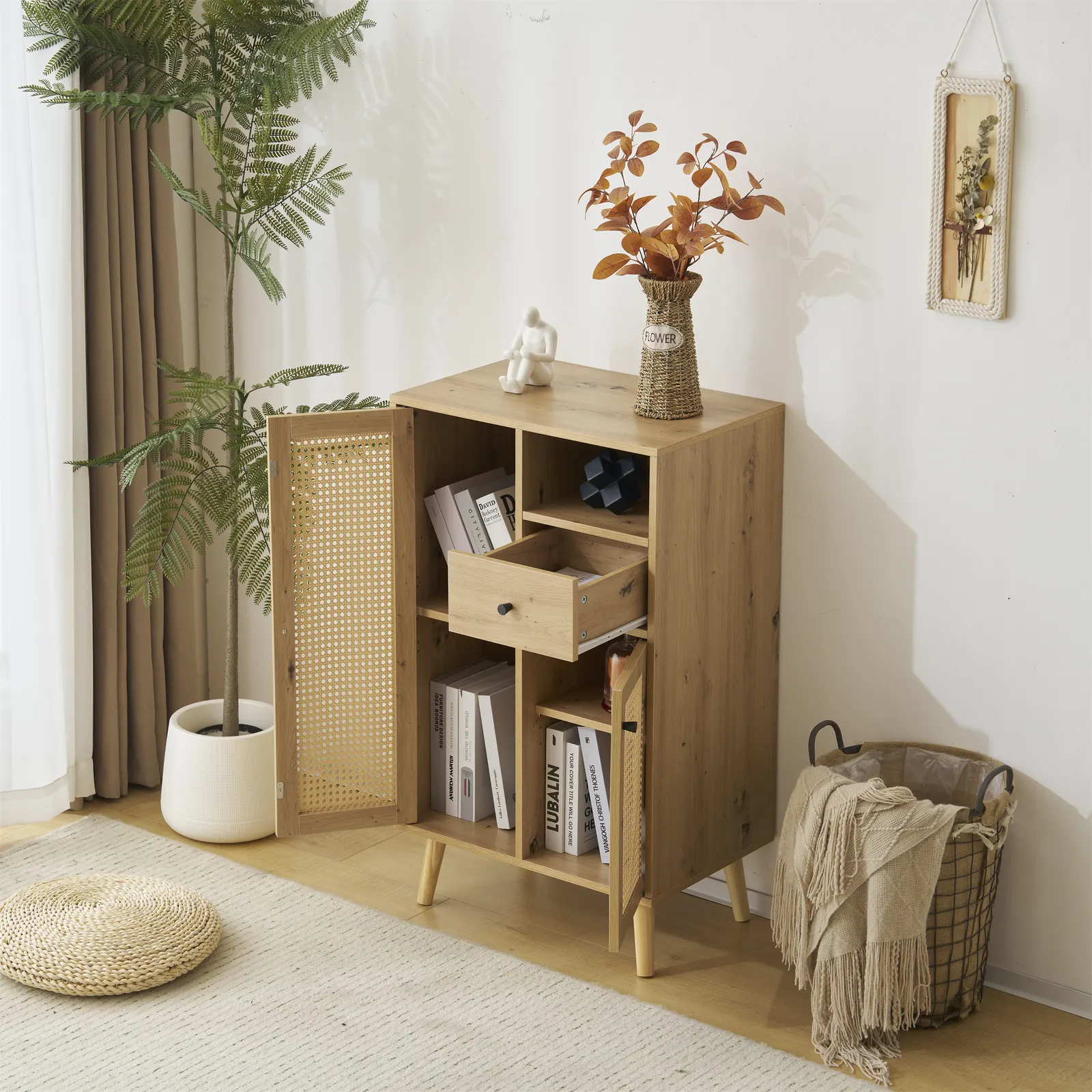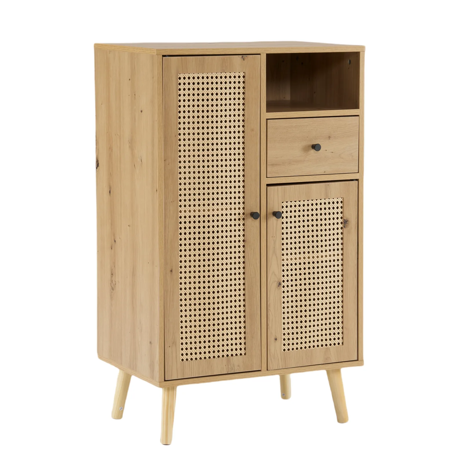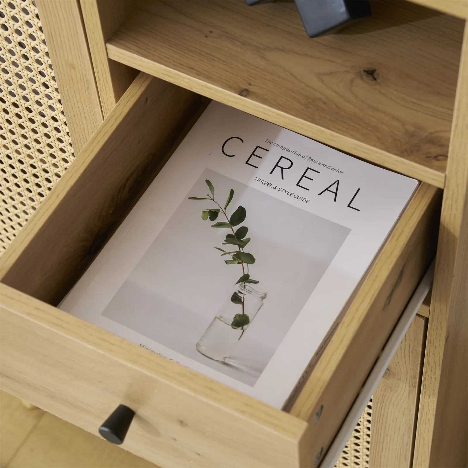 【おしゃれなラタン調デザイン】ラタンは繊細なかごめ編みを採用しており、圧迫感や重さが少ないのが特徴です。扉で隠し生活感のない洗練された雰囲気を演出、置くだけでセンスのあるお部屋に。目隠しと通気性を両立したラタン調の扉はポリエチレン素材を使用、お手入れも楽になりました。