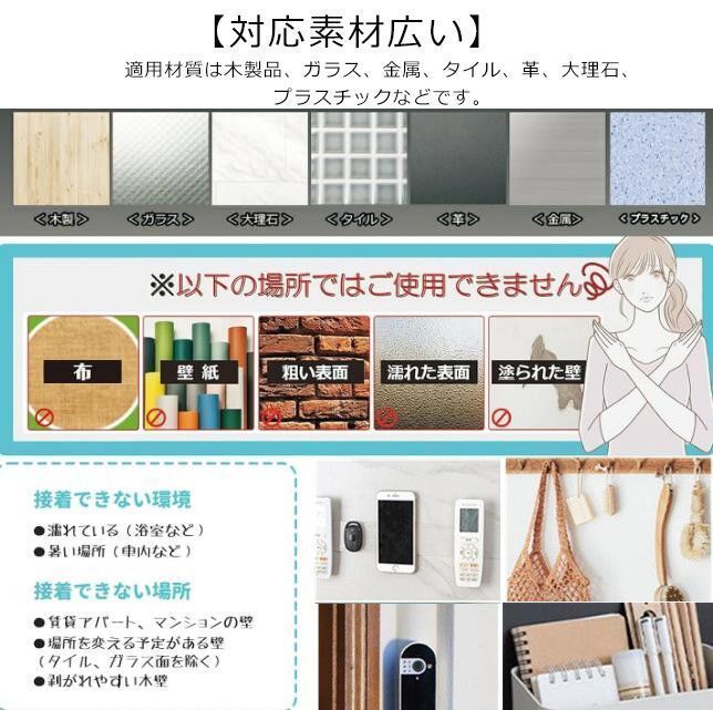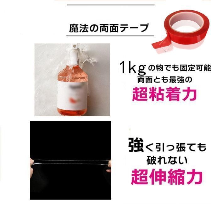 【対応素材広い&ご利用のヒント】本両面テープの性能が高くて、幅広く使われていて、平らな地面からザラザラの壁までほぼ対応できます。適用の表面は木製品から、ガラスや金属、タイル、革、大理石、プラスチックなどにはOKですが、粉塵だらけの壁と壁紙には向いておりませんので、何卒ご了承をお願い致します(壁紙のご利用である場合、もともと紙製なので、外す時には剥がれる可能性がございます。くれぐれもご注意くださいませ)。乾かし方:物をはさめる道具で普通に吊り下げてから、ベランダで服のように乾かしたらよろしいです。
