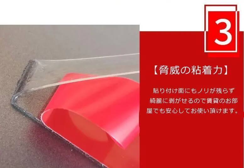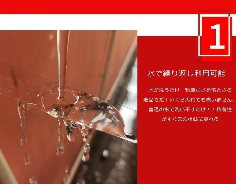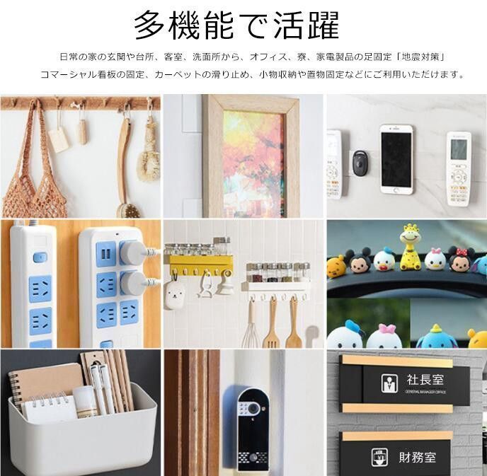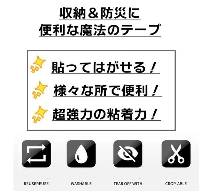 【水で繰り返し&多機能で活躍】更にこのテープは水で粘着性を回復できます!水で粉塵などを洗い落とし、テープを干してから、またもとのテープに戻れます。色んなシーンで大活躍します。日常の家の玄関や台所、客室、洗面所から、オフィス、寮、家電製品の足固定「地震対策」、コマーシャル看板の固定、カーペットの滑り止め、小物収納や置物固定などにご利用いただけます。テープの取るコツ:貼った後のテープの隙間に少し水を入れさせたら、自然に取れやすくなれます。原理:テープの粘着面が水分と接触すると、粘着性がしばらく減ります。取ってから干して水がなくなるまで、また粘着性が戻れます。