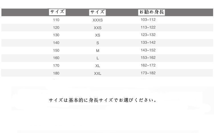 サイズ:110cm、120cm、130cm、140cm、150cm、160cm、170cm、180cm