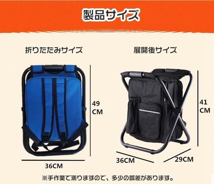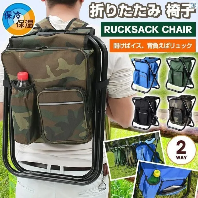 【商品の説明】 折りたたみ椅子×保冷機能付きバッグがひとつになった便利なリュック 待ち時間や疲れた時など、開くだけ組立が簡単なのでどこでも腰掛けることができる。 開けばイス、背負えばリュック! 背負えば水分などを持ち歩く際もらくらくですね♪