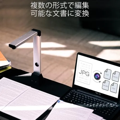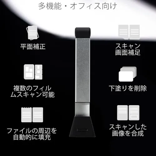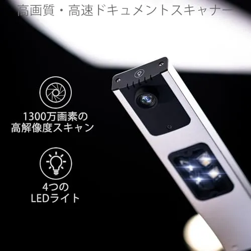 【使いやすい】スタンドスキャナーは4基のLEDライトを内蔵し、3段階の明るさ調整が可能。暗所でも均一な照明を実現し、書画カメラとして使用する際も良好な環境を提供します。卓上スキャナーの自動補正機能により、ページの歪みや傾きを補正し、良好な画質を維持。ページスキャナーとしても優れた性能を発揮します。