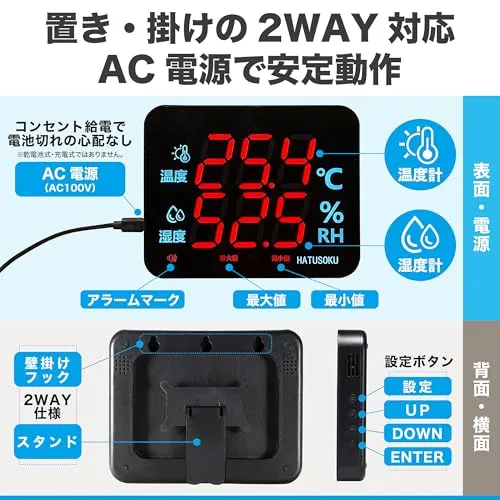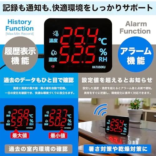 【温度と湿度のアラーム設定可能】温度と湿度ともに、上限値、下限値を超えたときにアラームが鳴るように設定することが可能。暑さ対策や乾燥対策に有用となっております。