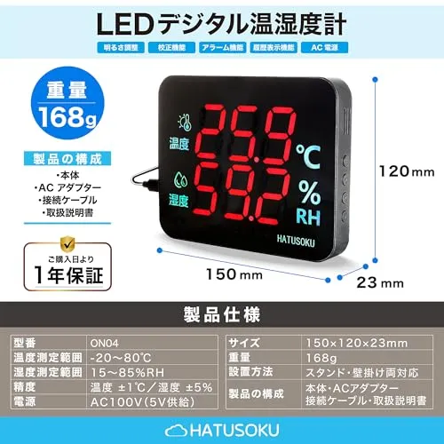【LED表示で見やすさ抜群】LED表示により、圧倒的な視認性。遠くからでもはっきりと見えるので、家庭はもちろん、オフィスや工場などの職場などでも皆が数値を確認しやすい温湿度計です。