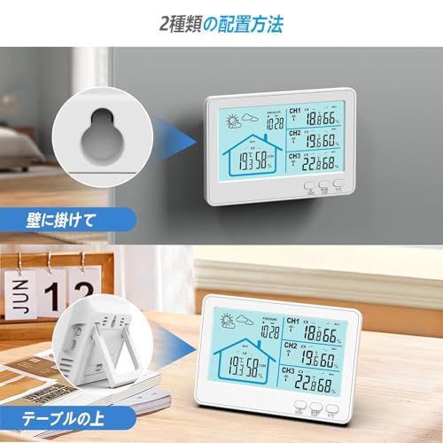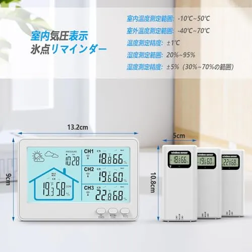 【室内屋外兼用&三個子機センサー】:屋内外用リモートセンサー、防水ではなく、最大通信距離100m、有効距離30m。子機センサーを利用して3ヵ所の温湿度の測定値を自動的に親機へ送信します。家族の健康管理に、インフルエンザや風邪な どの予防対策に、お部屋の乾燥チェックでお肌の潤いを保つのに、他にも、カビ対策や熱中症対策などに役立ちます。