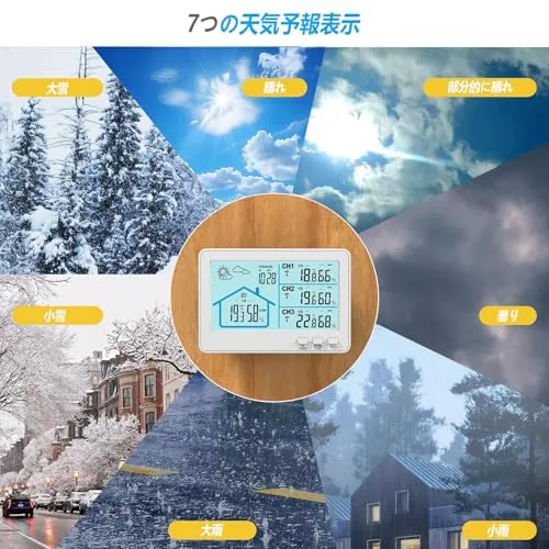 【天気予報機能】:もう天気を心配する必要はありません!屋内外の温度、湿度、気圧データをリアルタイムで取得。このワイヤレスウェザーステーションは、温度、湿度、気圧の変化を含む気象関連変数に基づいて、今後24時間の天気予報を計算し、あなたの場所の個人予報を生成します。