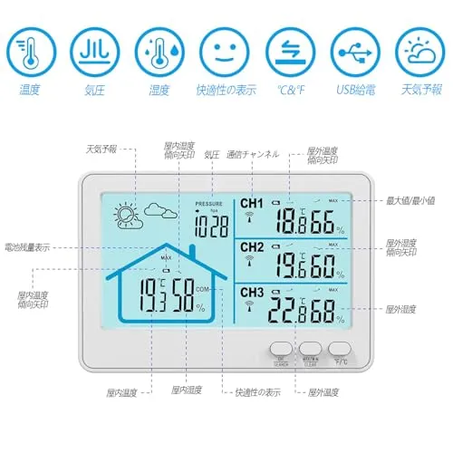 【複数データ表示】:大型LCDディスプレイは、室内/室外の湿度/温度、気圧、温度/湿度のトレンド、天気予報、快適レベル、氷点リマインダーを表示し、同時に最高と最低の温度と湿度を記録します。 より見やすく。バックライト機能は、薄暗い場所での使用に便利です。この製品は専門的な気圧測定装置ではありません。測定結果は参考用です。