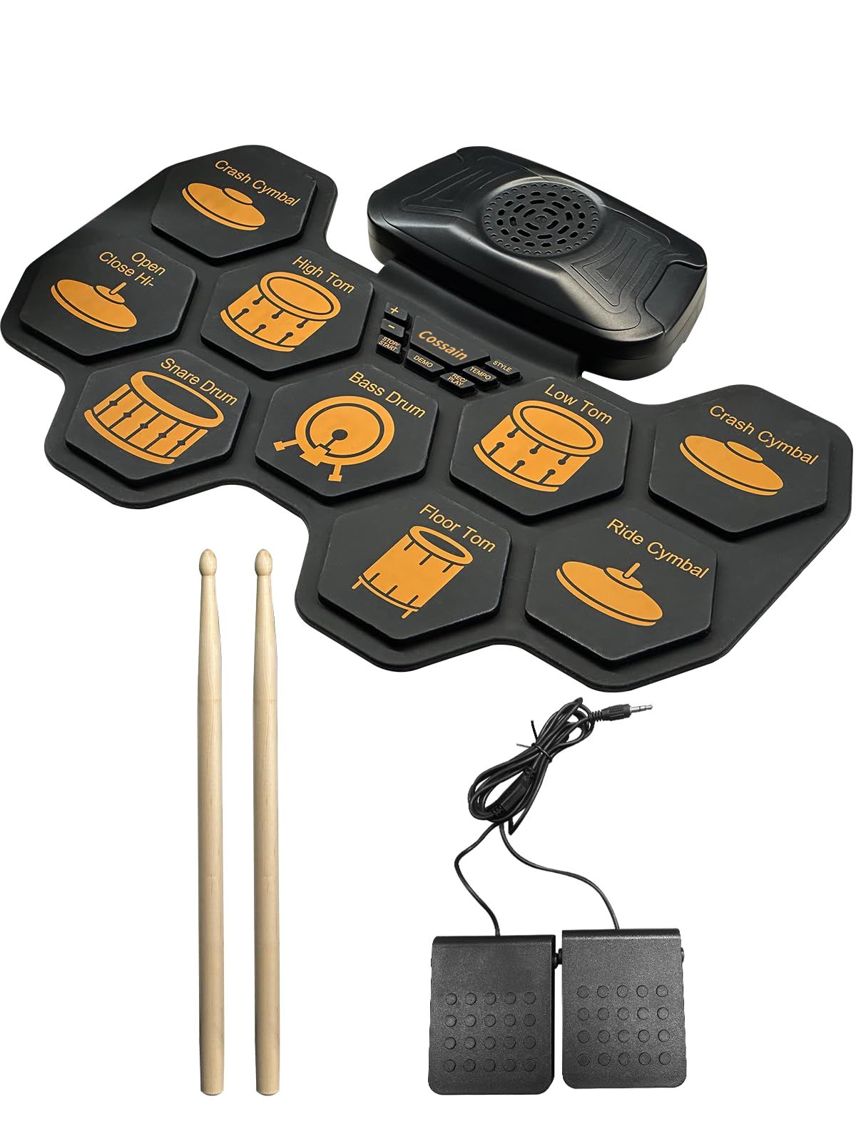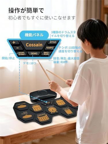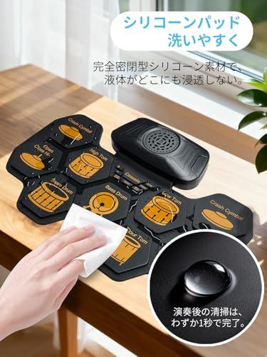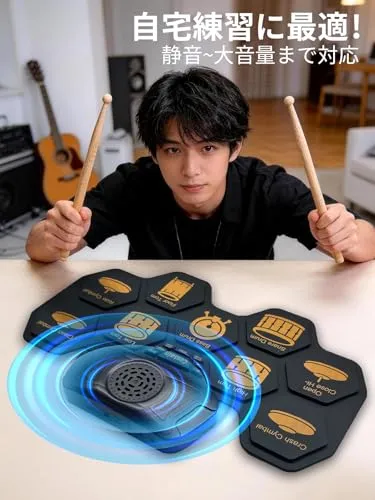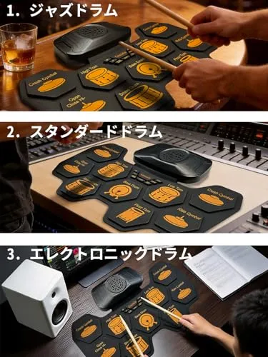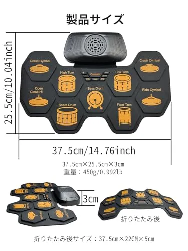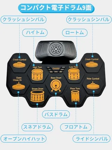 15 年専門製造実績 巻き取り式電子ドラム 9 パッド 軽量コンパクトで持ち運び・収納もラクラク。9 パッド標準レイアウト採用 リアルな打感と音色再現、伝統的ドラムセットの練習感が味わえる。
