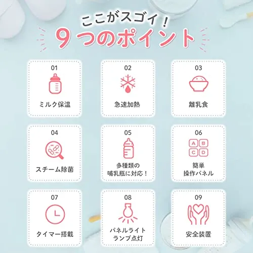 【スチーム除菌 / 多種類の哺乳瓶に対応 / 簡単操作パネル】 Kocokaraボトルウォーマーでは、最高温度約100の高温スチームで哺乳瓶やおしゃぶりなどの除菌なども可能Kocokaraボトルウォーマーでは、多種類の哺乳瓶に対応最大21cmの哺乳瓶が2本まで入ります誰でも簡単に操作していただけるように、タッチパネル設計を採用させて頂きました