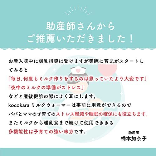 【ミルク保温 & 急速加熱 & 離乳食】 Kocokaraミルクウォーマーを使えば、夜間の授乳に大活躍夜中の授乳のストレス軽減、睡眠時間の確保にもつながり、調乳ポットの役割も果たしますKocokaraミルクウォーマーでは急速加熱モードが備わっており冷凍した離乳食や母乳を素早く解凍することが可能です離乳食モードでは、レトルト離乳食や作り置きした離乳食をムラなく温められ大変便利な機能となっております
