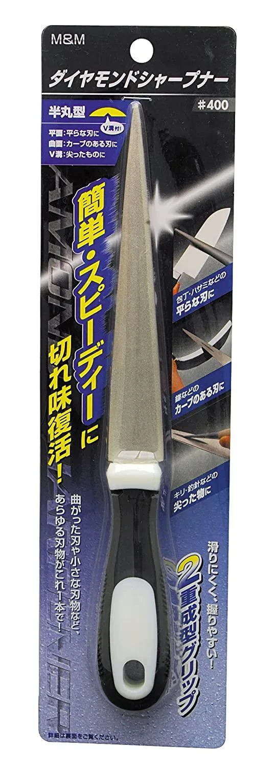 平面:包丁・刃物工具などに 曲面:園芸用鋏・鎌などに V字溝:釣針・キリなど尖った物に 簡単・スピーディーに切れ味復活 曲がった刃や小さい刃物など、あらゆる刃物がこれ1本で 滑りにくく、握りやすい 2重成型グリップ 本体:刃物鋼(表面:ダイヤモンド粒子) グリップ:TPR+PP