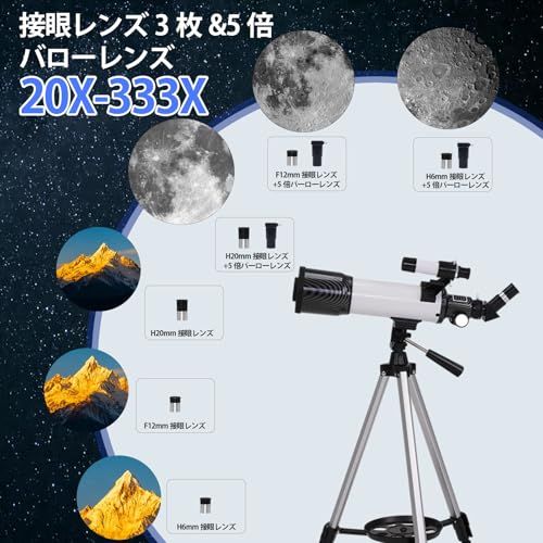 SPECILITE天体望遠鏡 天体観測 大口径70mm 焦点距離400mm 最大333倍 高倍率 自由調整可能なアルミ三脚 初心者&子供&大人に最適 持ち運びに便利 頑丈な天文屈折望遠鏡 スマホ撮影/生放送/星空観察/風景や動物の観察/誕生日/贈り物に適用 日本語取扱説明書付きt