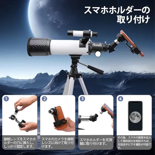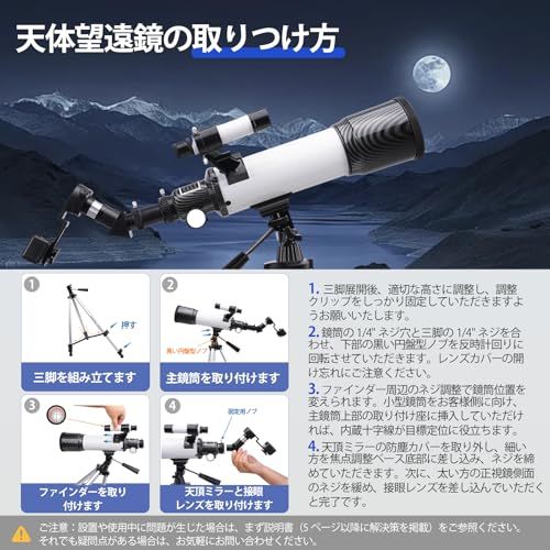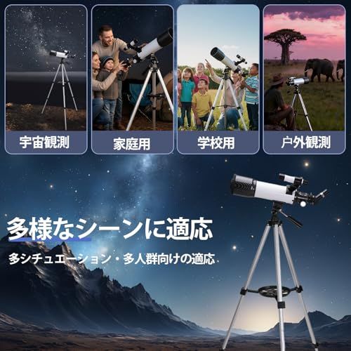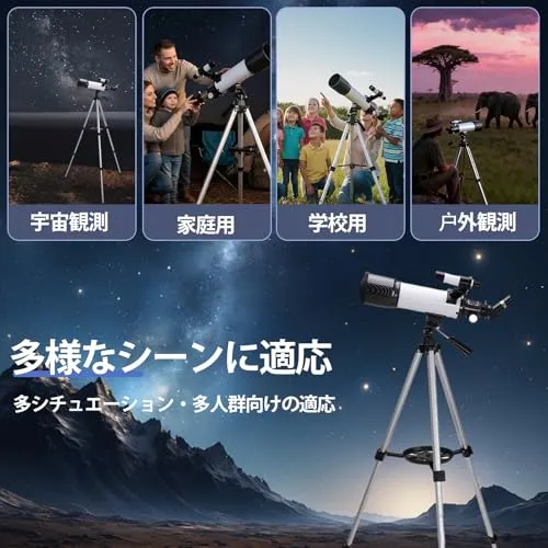 幅広い使用シーンに対応 晴れた夜には月、惑星、星団、土星などの天体観測に最適で、昼間は遠方の風景も観察可能があります。低倍率アイピースは星空の眺めに、高倍率アイピースは天体の詳細な観察に適しています。アウトドア風景、キャンプでの星空観察、天文教育など多様なシーンで使用可能できます。子供から大人、天文初心者まで誰でも簡単に操作できます