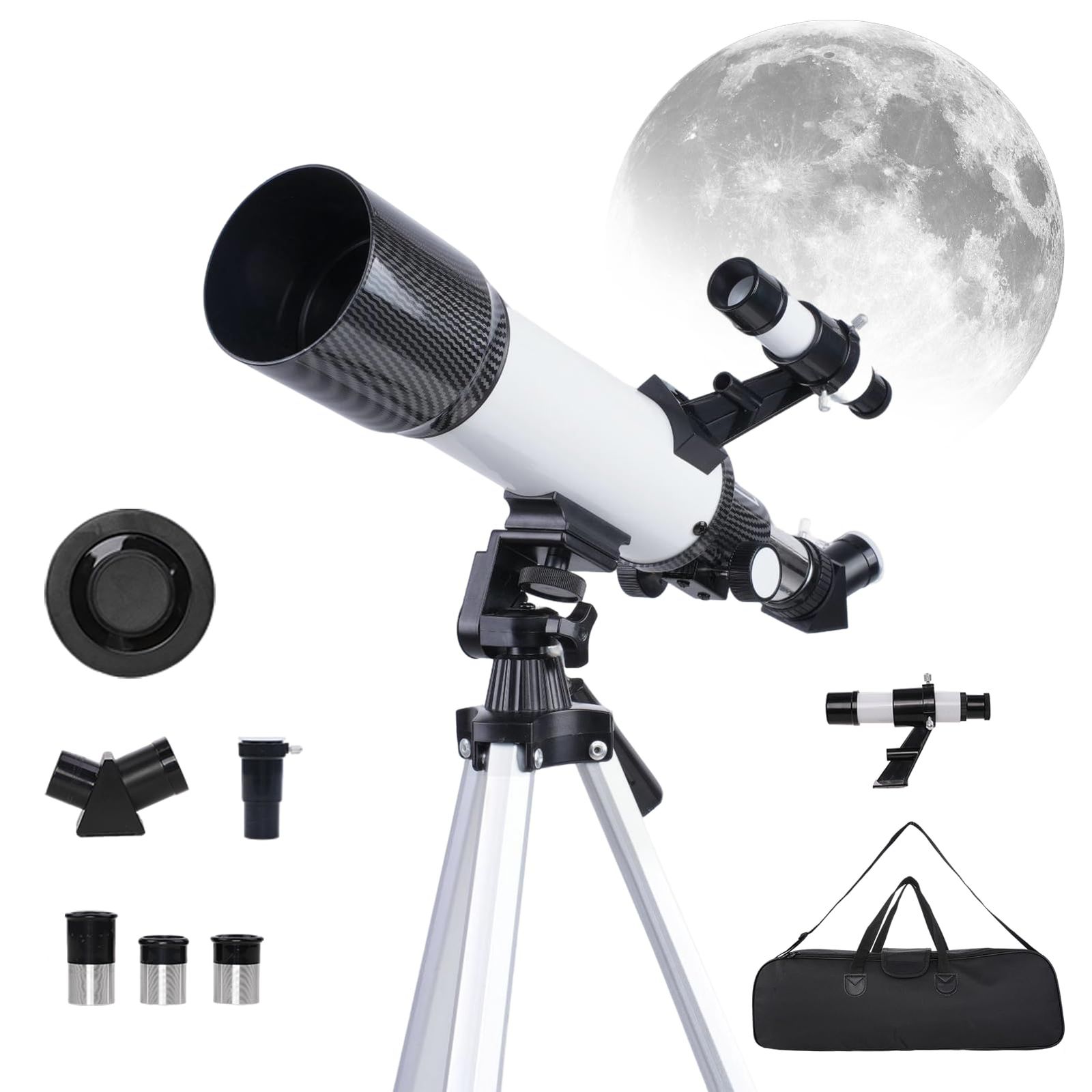 光学性能が卓越:70mm大口径対物レンズと400mm焦点距離設計を採用し、屈折式光学構造とFMC全面コーティングを組み合わせることで、高い光透過率を実現し、鮮明でシャープな像を投影します。5X24光学ファインダー(内蔵十字線)を装備し、月や惑星などの天体を迅速かつ正確に位置決め。観測に明瞭で明るく広大な視野を提供し、月面の細部や惑星の表面構造を鮮明に再現します