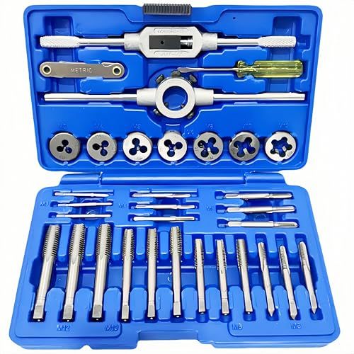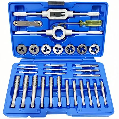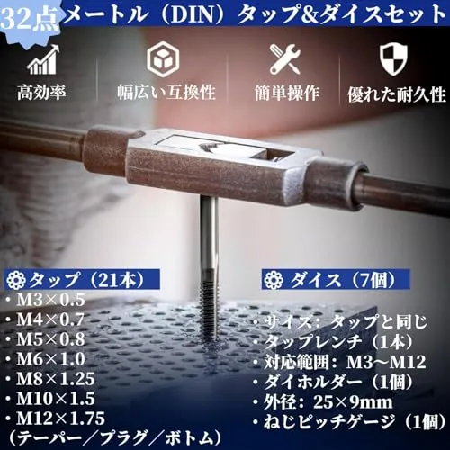 【32点オールインワン工具セット】本製品は、21本のタップ(M3~M12のテーパー・プラグ・ボトム)、7個のダイス、タップレンチ、調整可能なダイストックレンチ、1/8インチマイナスドライバー、ネジピッチゲージ、収納ケースを含む、汎用性の高い32点セット。ネジ切り・修正・補修に必要な基本ツールがすべて揃っています。