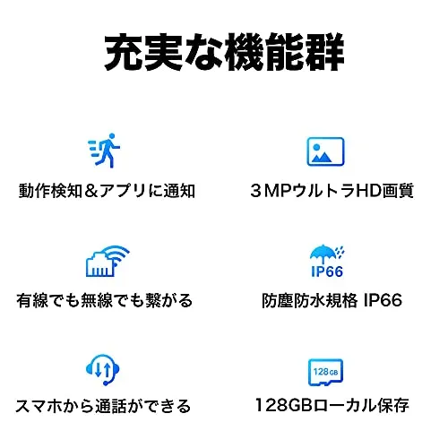 ご覧いただきありがとうございます 即購入OK! 丁寧な梱包・発送でお届けいたします。 よろしくお願い致します [特徴] Wi-Fiでつながる高画質アウトドア用カメラ [有線でもWi-Fiでも] 有線でもWi-Fiでもネットワークに繋がる [アドバンス夜間撮影] 夜中でも最長30mまでの距離を確認可能 [アラーム機能] アラーム機能搭載 [相互音声会話] スマホから相互音声会話対応 [IP66 全天候型] 雨やホコリのある過酷な環境でもしっかりと動作します。