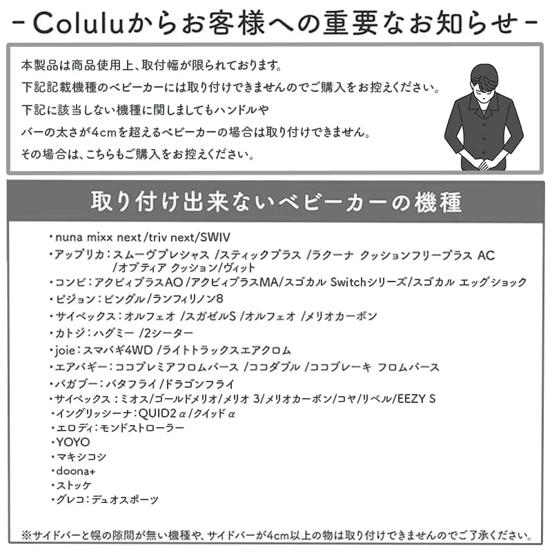 【取り付け出来ないベビーカーの機種】 ・nuna mixx next / triv next / SWIV ・アップリカ:スムーヴプレシャス / スティックプラス / ラクーナ クッションフリープラスAC / オプティア クッション / ヴィッタ・コンビ:アクセルプラスAO / アクセルプラスMA / スゴカル Switchシリーズ / スゴカル エッグショック・ピジョン:ビングル / ランフィリノV8・サイベックス:オルフェオ / オルガゼルS / オルフェオ / メリオカーボン・カトージ:ベビーカー / 2シーター・joie:スマバギ4WD / ライトトラックスエアクロム・エアバギー:ココプレミア フロムバース / ココダブル / ココブレーキ フロムバース・バガブー:バタフライ / ドラゴンフライ