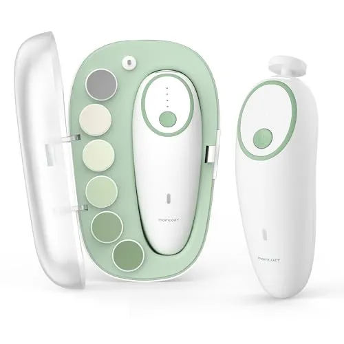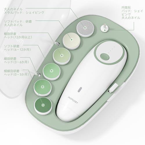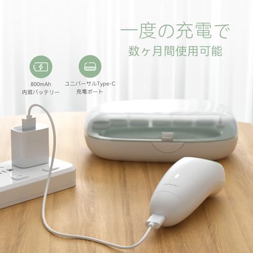 充電式タイプ ? Momcozy電動ベビーネイルケアは、バッテリー内蔵タイプです。乾電池式の一般的なベビーネイルカッターやネイルトリマーと比べて、電池交換の手間がなく、付属の一般的なType-Cケーブル(収納ケースの下にあります)で簡単に充電できます。