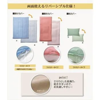 掛布団カバー、敷布団カバー、枕カバーの3点セットです。サラッとした肌触りで、季節を問わずオールシーズンご使用いただけます。フルオープン式ファスナー付きで、縦方向にファスナーが付いているためスムーズな出し入れが可能です。また、掛布団カバーには、布団とカバーがズレにくいよう四隅に固定ヒモを付けております。