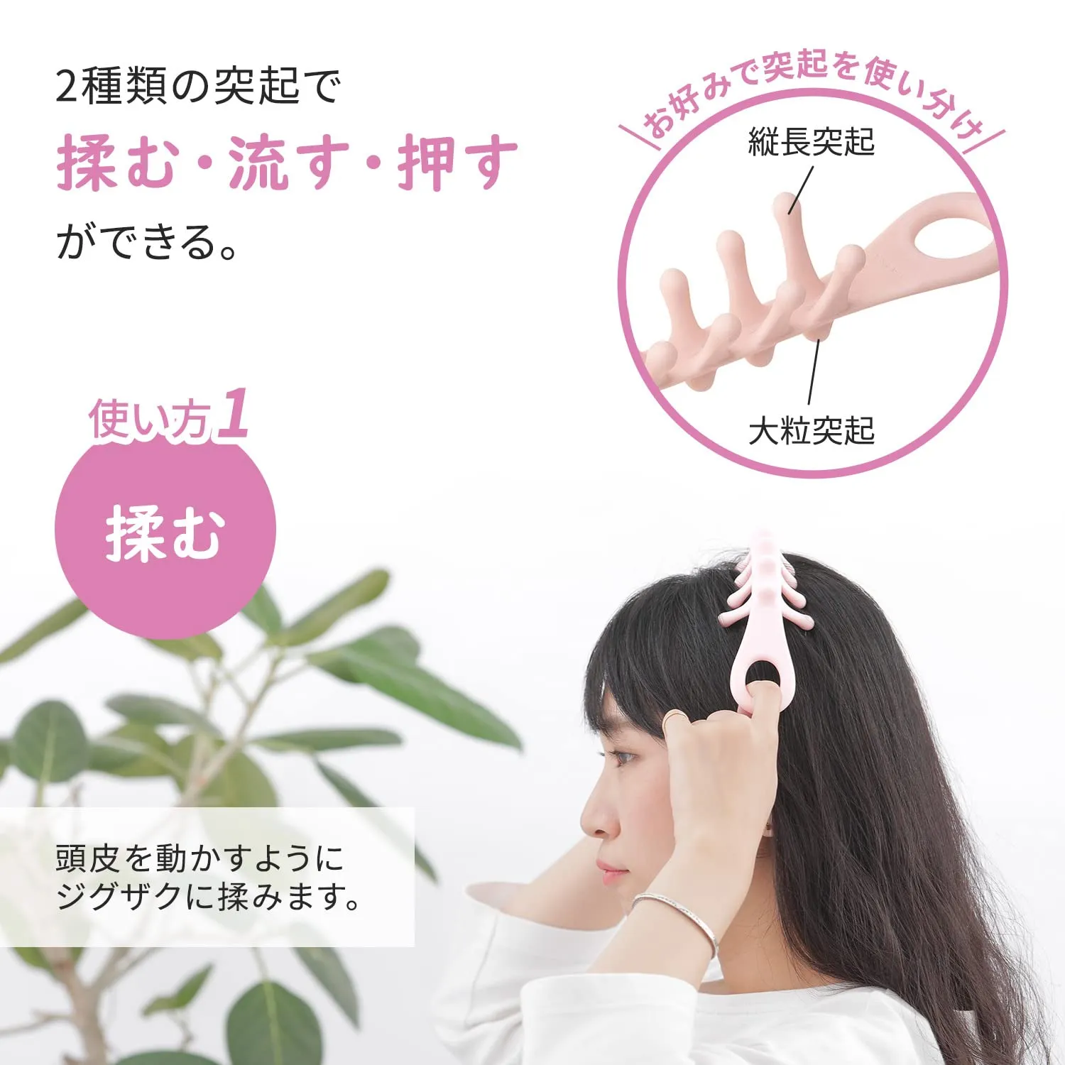 【気持ちのいい使い方】頭皮を動かすようにジグザグに「揉み」、頭から後頭部にかけて髪を溶かすように「流し」、頭の気持ちの良いポイントを「押し」ます。細長突起と大粒突起でお好みに合わせて使い分けできます。