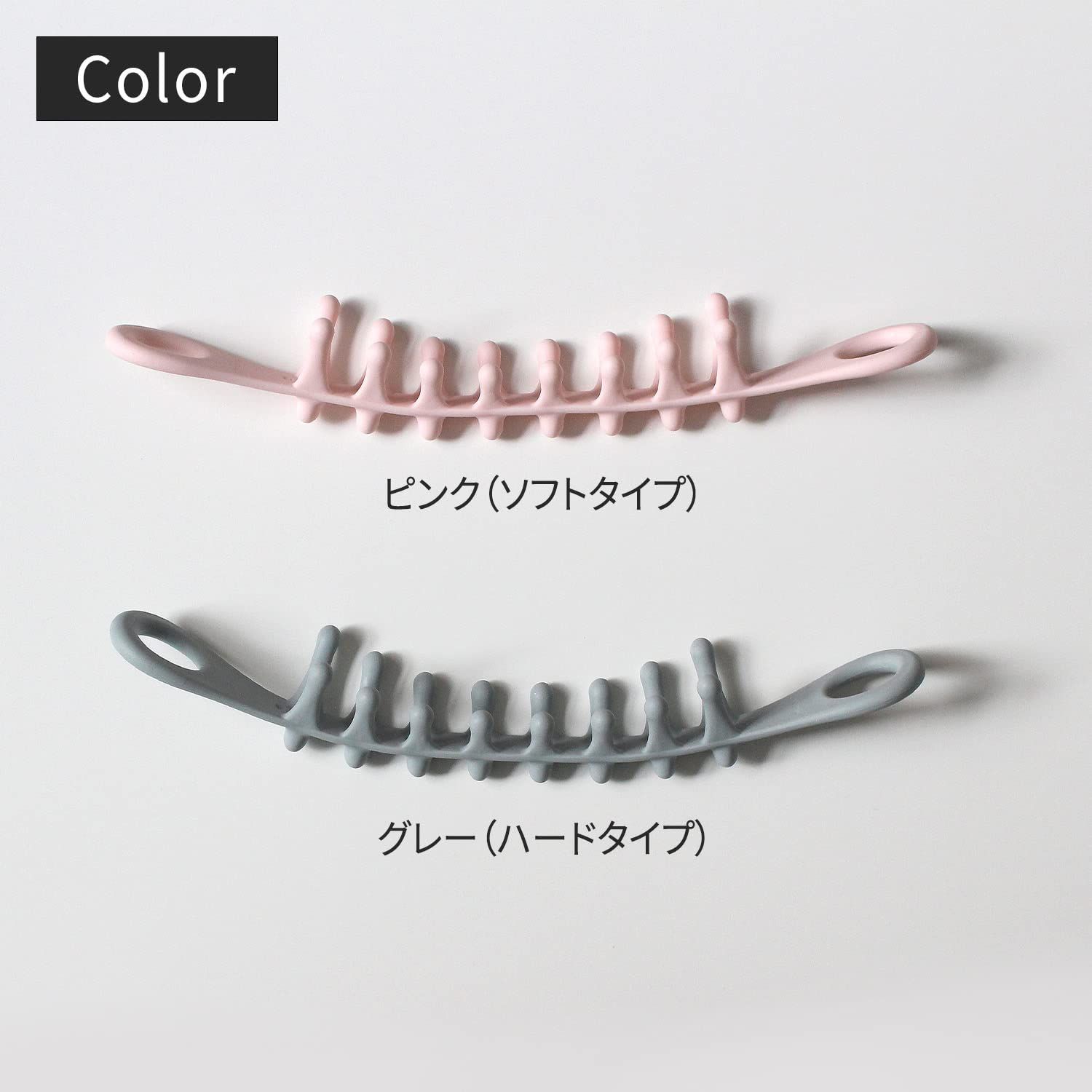 後頭部や首にもフィットして、しっかりほぐせます。グレーはハード、ピンクはソフトな使い心地です。