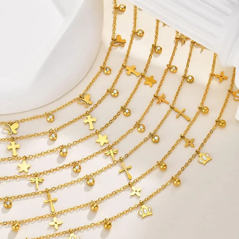 Rockyuのレディースアンクレットは、蝶や十字架、星などの幾何モチーフをバランスよく配置したデザインが魅力です。素材にはステンレスを使用し、ゴールド色仕上げにより足元を華やかに演出します。丸玉パーツとキュービックジルコニアがさりげない輝きを添え、シンプルながらも存在感のある印象に。チェーンタイプで全長約22cm、アジャスター約5cm付きのためサイズ調節が可能です。軽量設計で日常使いしやすく、サンダルやパンプス、リゾートファッションにも自然に馴染みます。プレゼントとしても選びやすいアンクレットです。