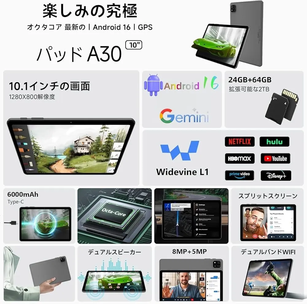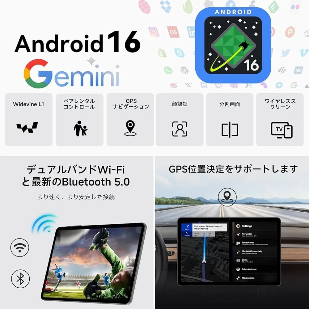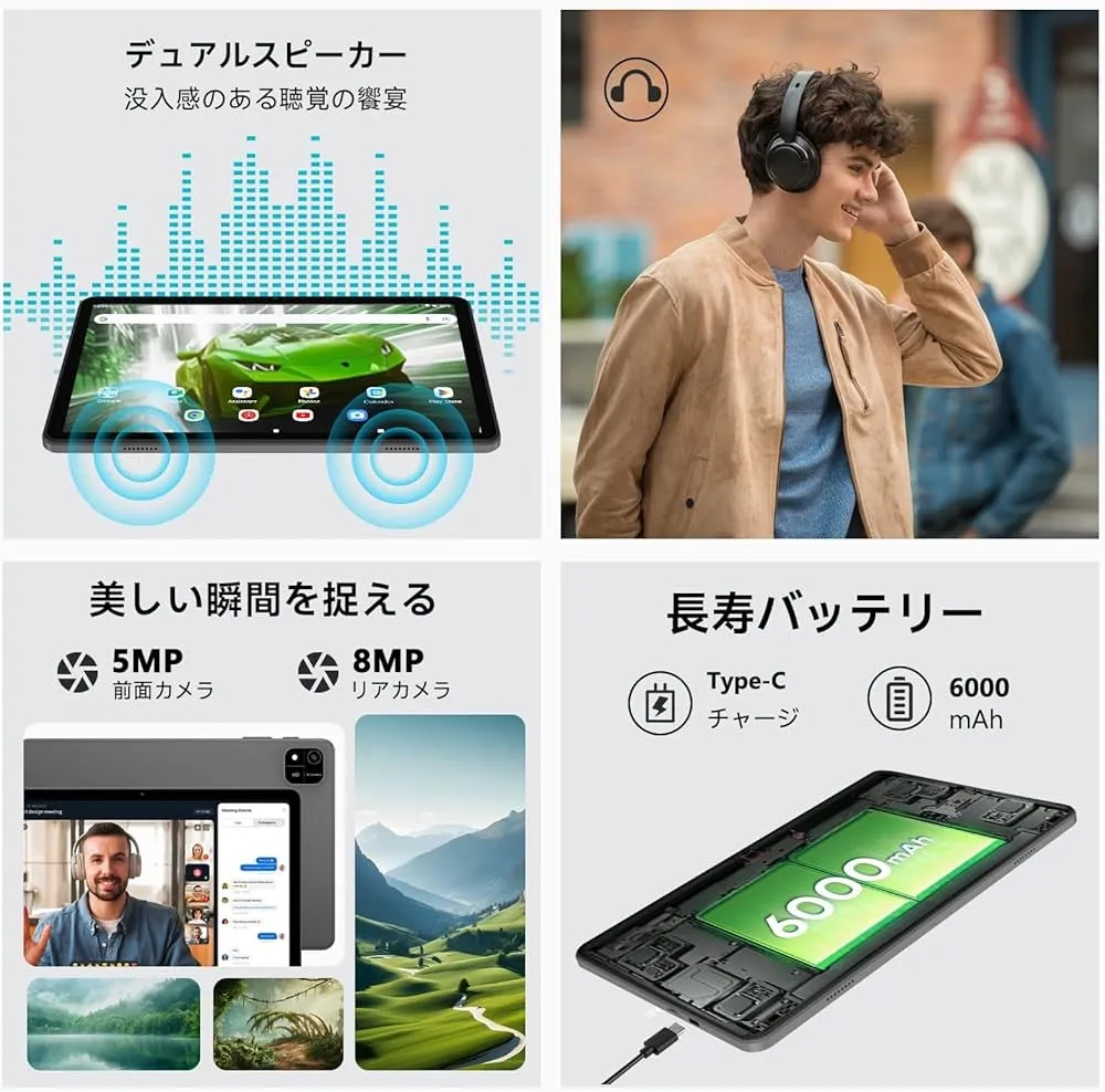 【64GB/24GB/2TB拡張+10.1インチIPSディスプレイ+8 コア CPU+Gemini AI】 64GB ストレージ + 最大 24GB メモリ(4GB+20GB 拡張)、複数アプリ同時開いても「サクサク動く」。MicroSD で最大2TB 拡張可、動画・写真大量保存自在。10.1 インチ Incell-IPS ディスプレイ、1280×800 高解像度 + 鮮やか発色、Netflix・YouTube 視聴に臨場感。16:10 比率で電子書籍・漫画も見やすく、300nit 高輝度で屋外視認も鮮明。8 コア CPU(2.2GHz)搭載、マルチタスク・アプリ切り替え・動画再生も滞りなし。Gemini AI による動作最適化、アプリ起動・切り替えスムーズ、日常シーンで「サクサク動く」体感実現。