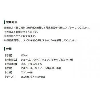 シューズだけでなく、バッグ内の嫌なにおい、キャップやジャケットなどのウェアに付着した皮脂や汗、タバコのにおいも素早く解消し、フレッシュな状態を保ちます。においの元とにおいそのものにWで効く!