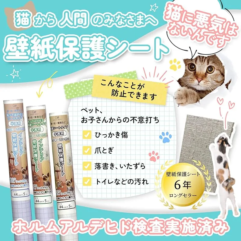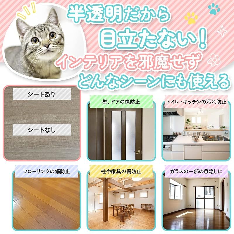 【こんな方におすすめ】 ・猫の爪とぎ対策をしたい方 ・犬のトイレ周り、ケージ、壁、床の汚れ防止したい方 ・子どもの落書きやシール貼り、トイレの尿飛びで困っている方 ・キッチン周りの油汚れ、油はね、洗面台、冷蔵庫・家具の背後などの汚れを防止したい方 ・賃貸で壁紙をきれいに保ちたい方