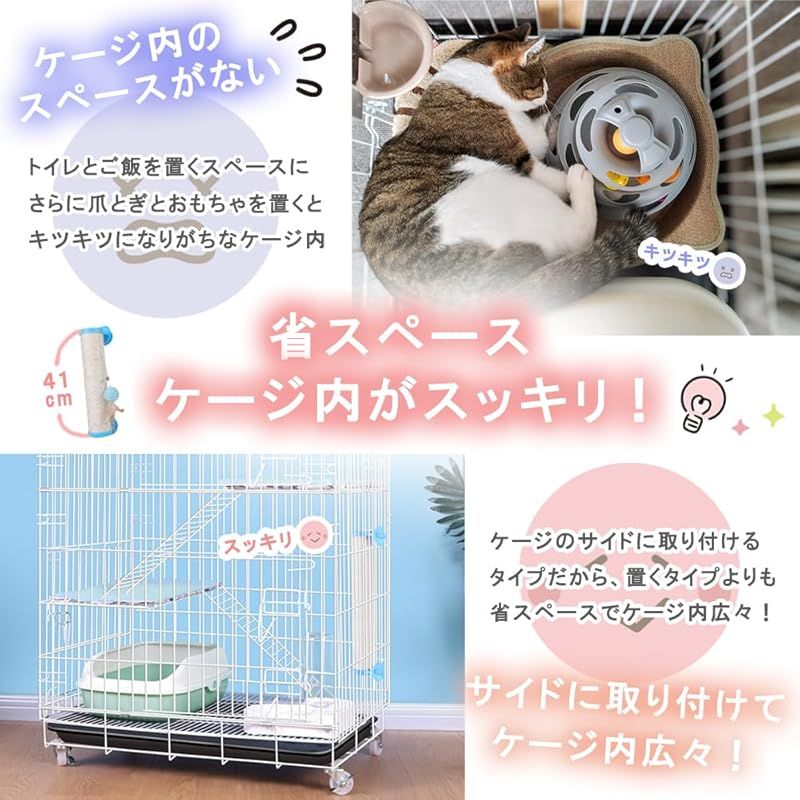 【省スペースでケージ内がスッキリ!】トイレとご飯を置くスペースにさらに爪とぎとおもちゃを置くとキツキツになりがちなケージ内。ケージのサイドに取り付けるタイプだから、置くタイプよりも省スペースでケージ内を広々使えます。