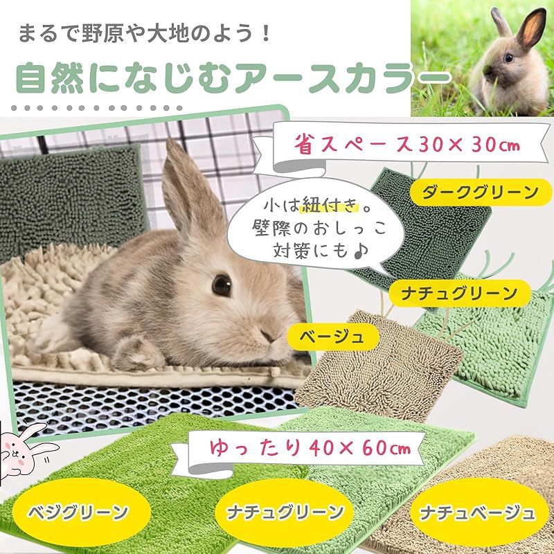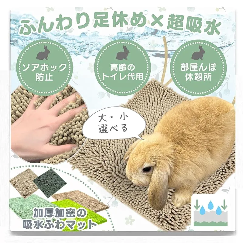 『吸水ふわケアマット』は、うさぎさんの足の休息(ソアホック防止)とトイレのケアを両立できるよう設計されており、小さいサイズの30*30cmから大きいサイズの40*60cmまで環境に合わせてお選びいただけます。 また高齢のうさぎのトイレ問題にも対応できるため、介護用としても適しています。 うさぎさんの健康的な生活を支える便利なアイテムとしてケージや部屋んぽにぴったりです♪