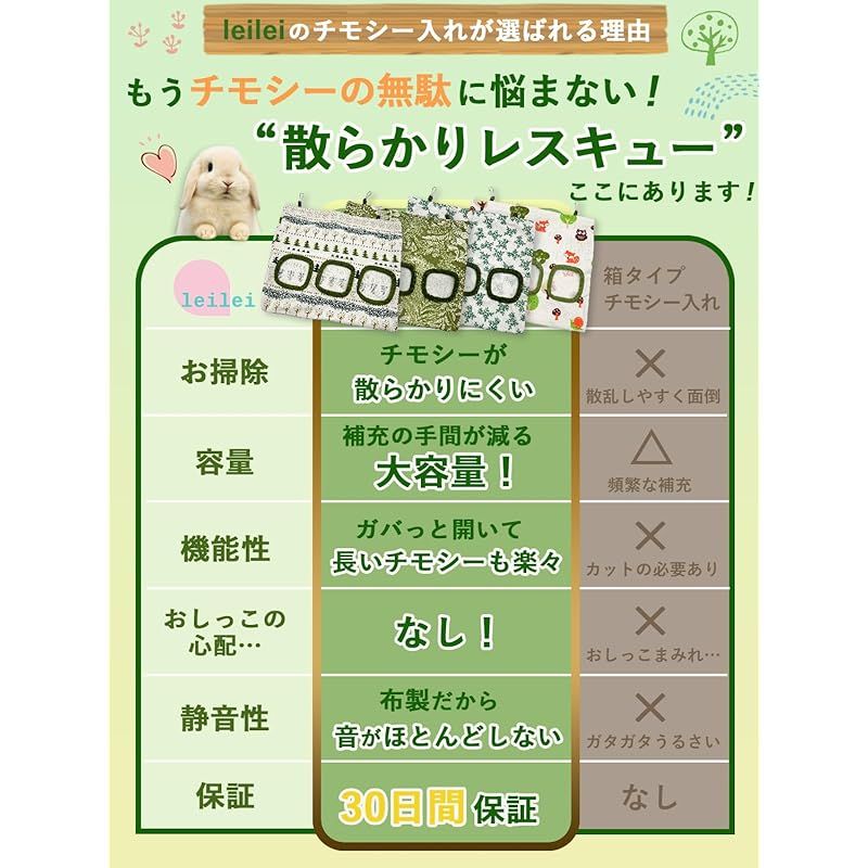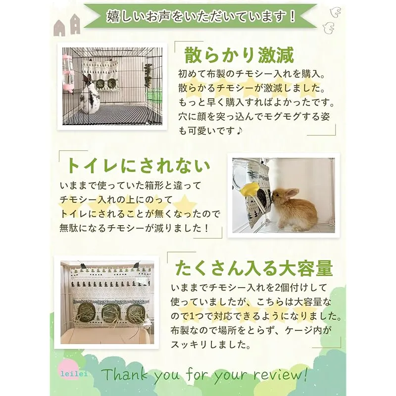 【チモシーが散らかりにくい】チモシーがこぼれ落ちにくく、床に散らかりにくい布タイプ。また、ケージにぶつかってもあまり音がしないので、うさぎさんの食事中でも音が気にならない!