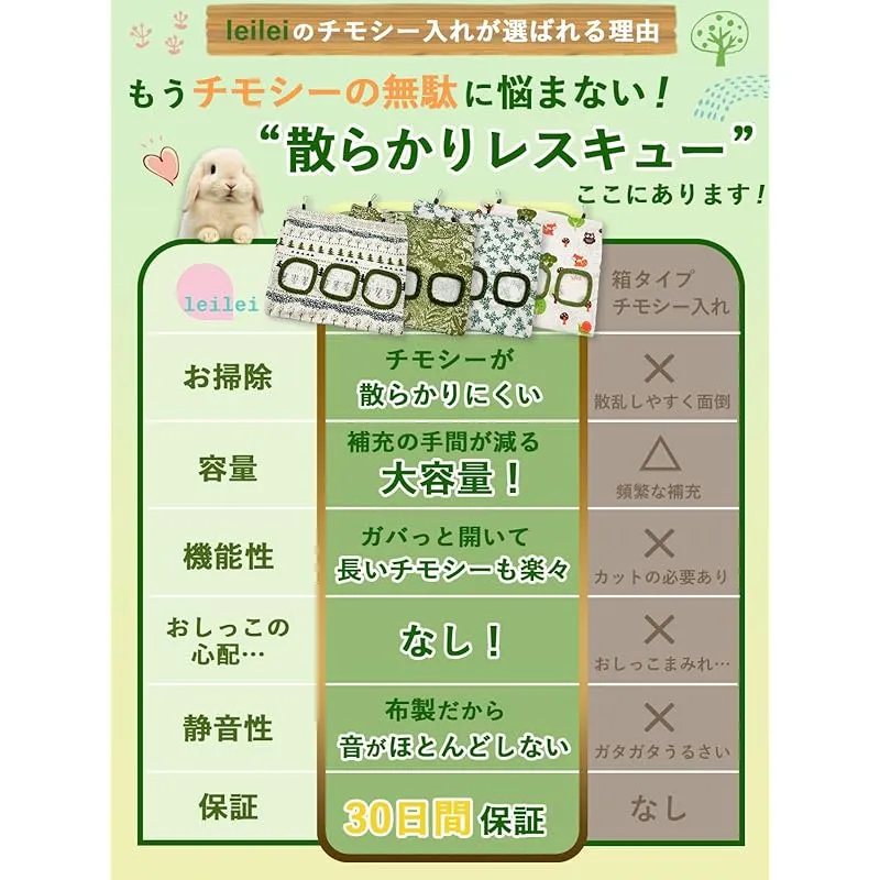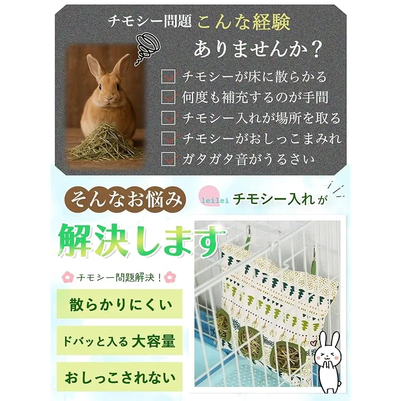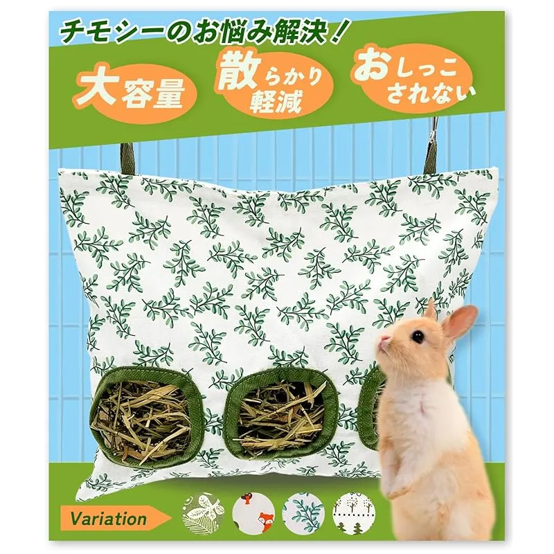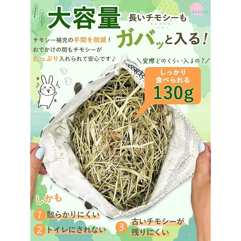 【チモシーが散らかりにくい】チモシーがこぼれ落ちにくく、床に散らかりにくい布タイプ。また、ケージにぶつかってもあまり音がしないので、うさぎさんの食事中でも音が気にならない!
