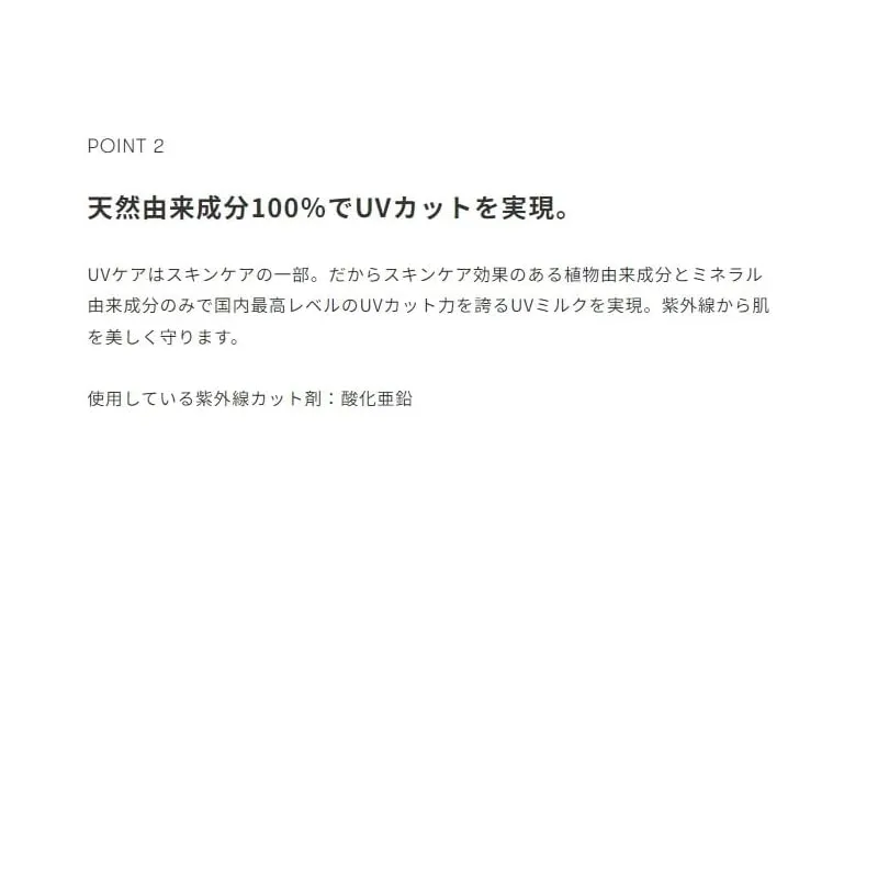 ≪ POINT2 ≫ 天然由来成分100%でUVカットを実現。:UVケアはスキンケアの一部。だからスキンケア効果のある植物由来成分とミネラル由来成分のみで国内最高レベルのUVカット力を誇るUVミルクを実現。紫外線から肌を美しく守ります。 使用している紫外線カット剤:酸化亜鉛