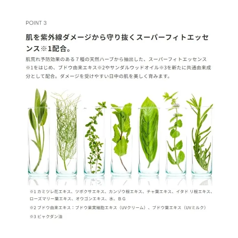 ≪ POINT3 ≫ 肌を紫外線ダメージから守り抜くスーパーフィトエッセンス※1配合。肌荒れ予防効果のある7種の天然ハーブから抽出した、スーパーフィトエッセンス※1をはじめ、ブドウ由来エキス※2やサンダルウッドオイル※3を新たに共通由来成分として配合。ダメージを受けやすい日中の肌を美しく育みます。 ※1 カミツレ花エキス、ツボクサエキス、カンゾウ根エキス、チャ葉エキス、イタド リ根エキス、ローズマリー葉エキス、オウゴンエキス、水、BG ※2 ブドウ由来エキス:ブドウ果実細胞エキス(UVクリーム)、ブドウ葉エキス(UVミルク) ※3 ビャクダン油