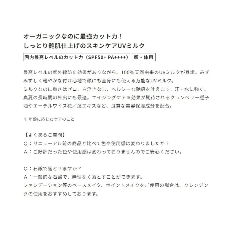 最高レベルの紫外線防止効果がありながら、100%天然由来のUVミルクが登場。みずみずしく軽やかな付け心地で顔にも全身にも使える万能なUVミルク。 ミルクなのに重さはゼロ、白浮きなし、ヘルシーな艶感を叶えます。汗・水に強く、真夏の長時間の外出にも最適。エイジングケア*効果が期待されるクランベリー種子油やエーデルワイス花/葉エキスなど、良質な美容保湿成分を配合。 使用方法 よく振ってからお使いください。スキンケア後、適量を手にとり肌になじませます。化粧下地としてや体にもお使いいただけます。SPF50 PA++++