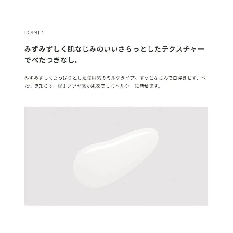 ≪ POINT1 ≫ みずみずしくさっぱりとした使用感のミルクタイプ。すっとなじんで白浮きせず、べたつき知らず。程よいツヤ感が肌を美しくヘルシーに魅せます。