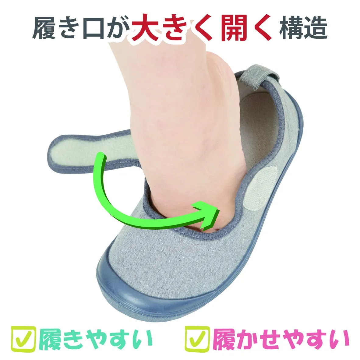 面ファスナー(マジック式)の着脱ベルトで間口が大きく広がり履きやすく履かせやすい。微調整も可能。