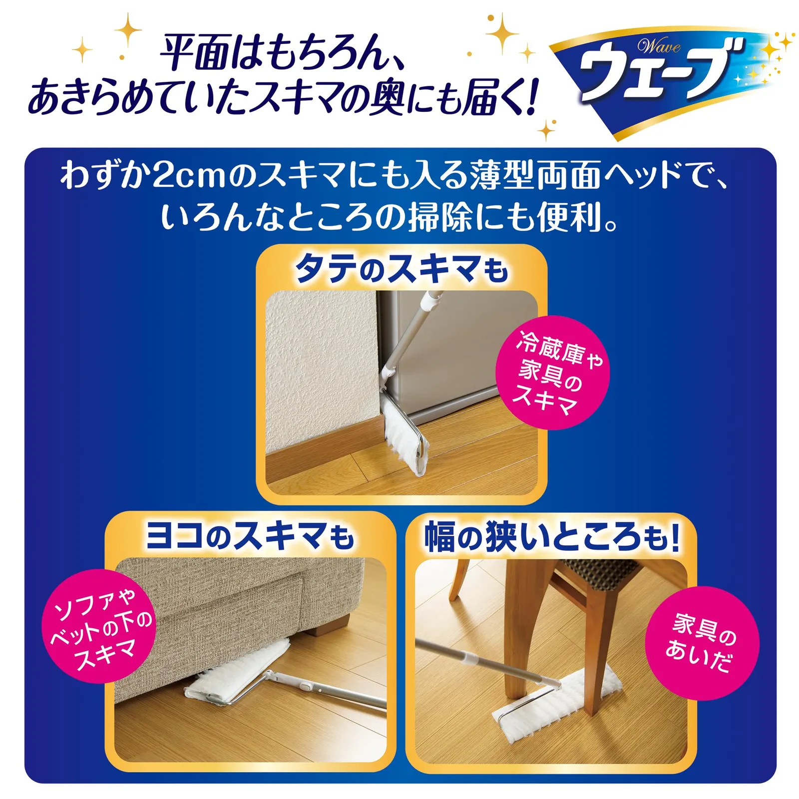 新開発! ヘッドの厚み16mmの薄型フルフラット構造で、あきらめていたわずか2cmのスキマまで入り込み奥まで拭きとれます。