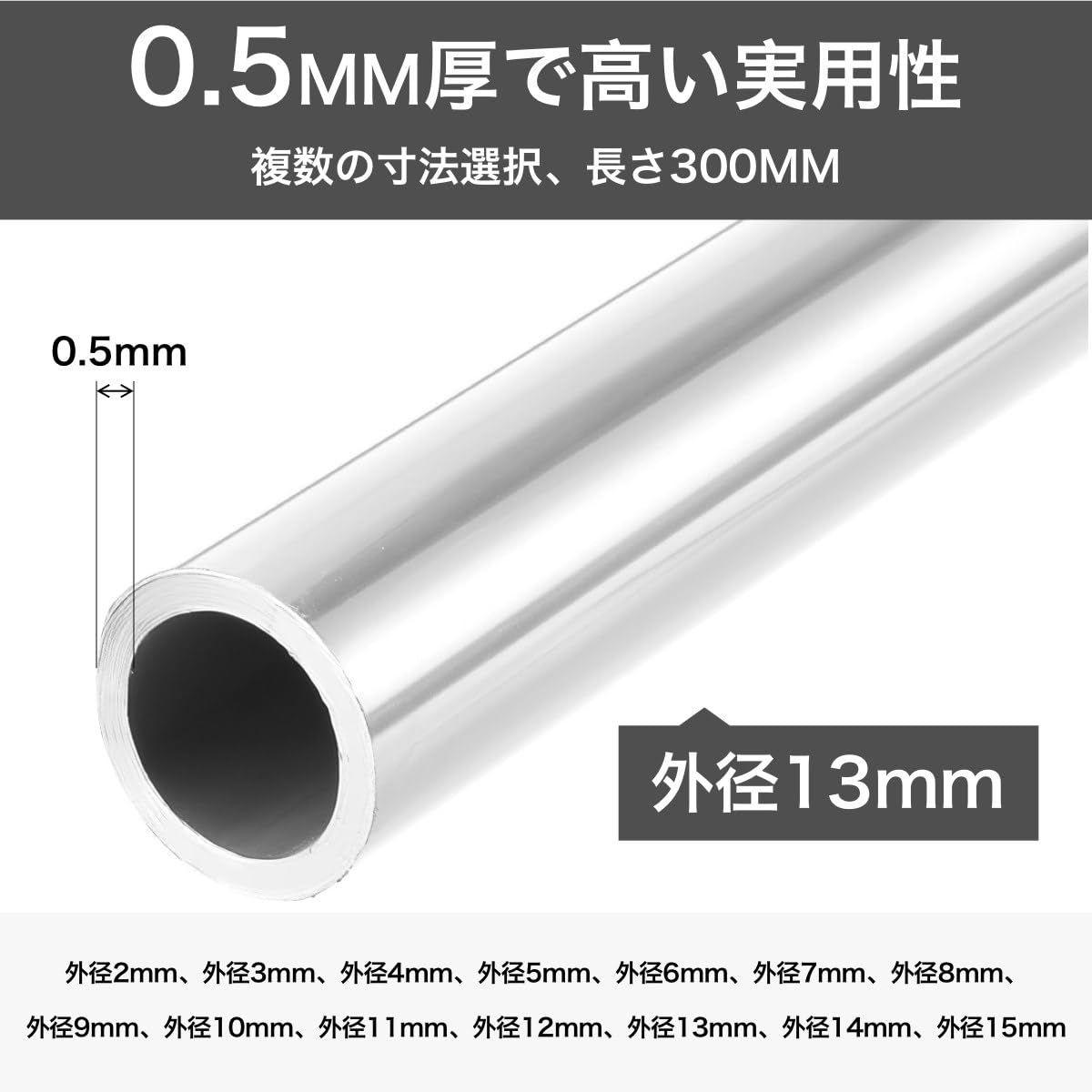 [多様な仕様] 製品名: アルミ丸管; 内径: 12mm; 外径: 13mm; 壁厚さ: 0.5mm; 長さ: 300mm; 材質: A6063アルミ; パイプタイプ: シームレスストレートパイプチューブ