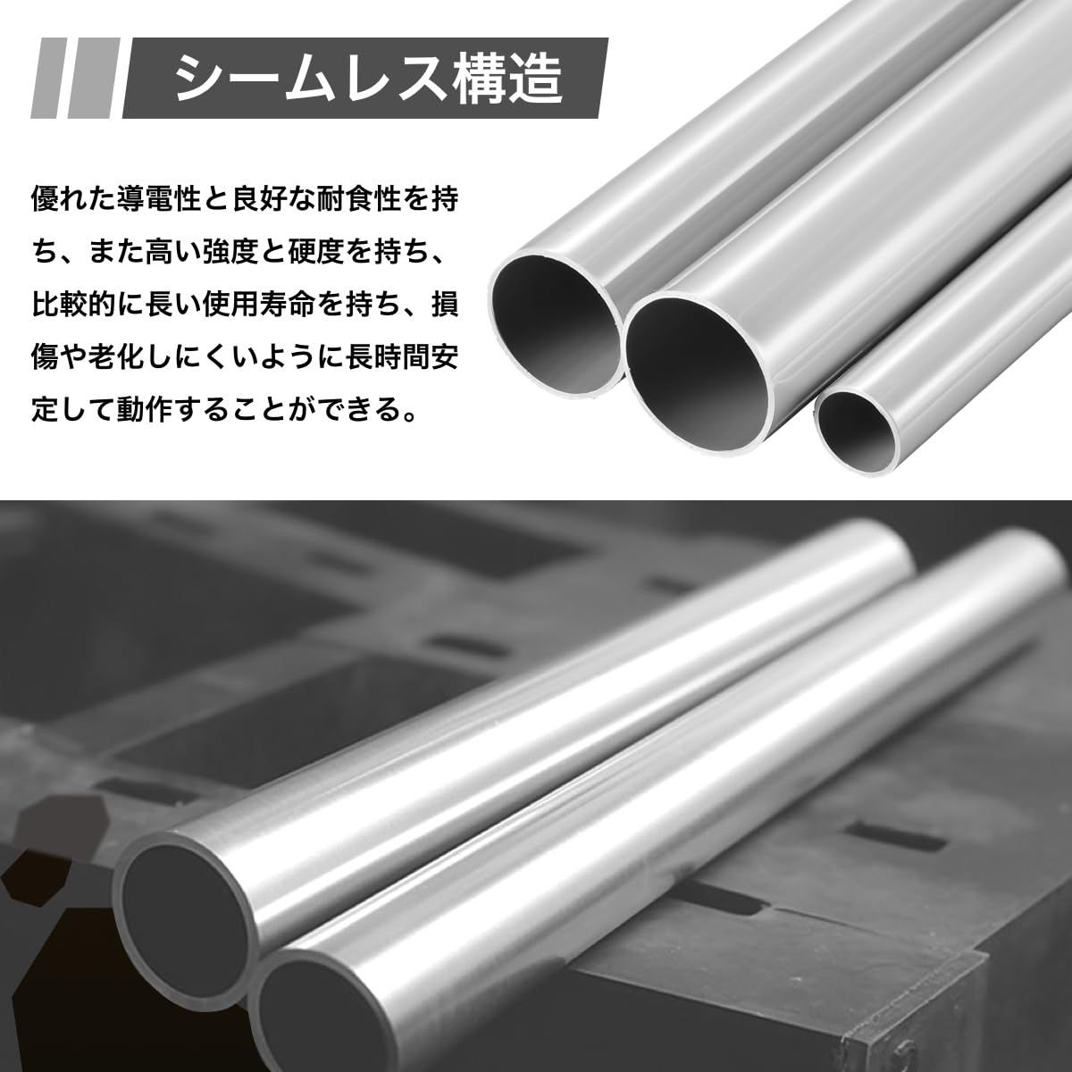 [シームレス構造] 表面も内部も継ぎ目がなく、滑らかであり、切断、打ち抜き、溶接などの加工が可能です。精密な用途に適しています。