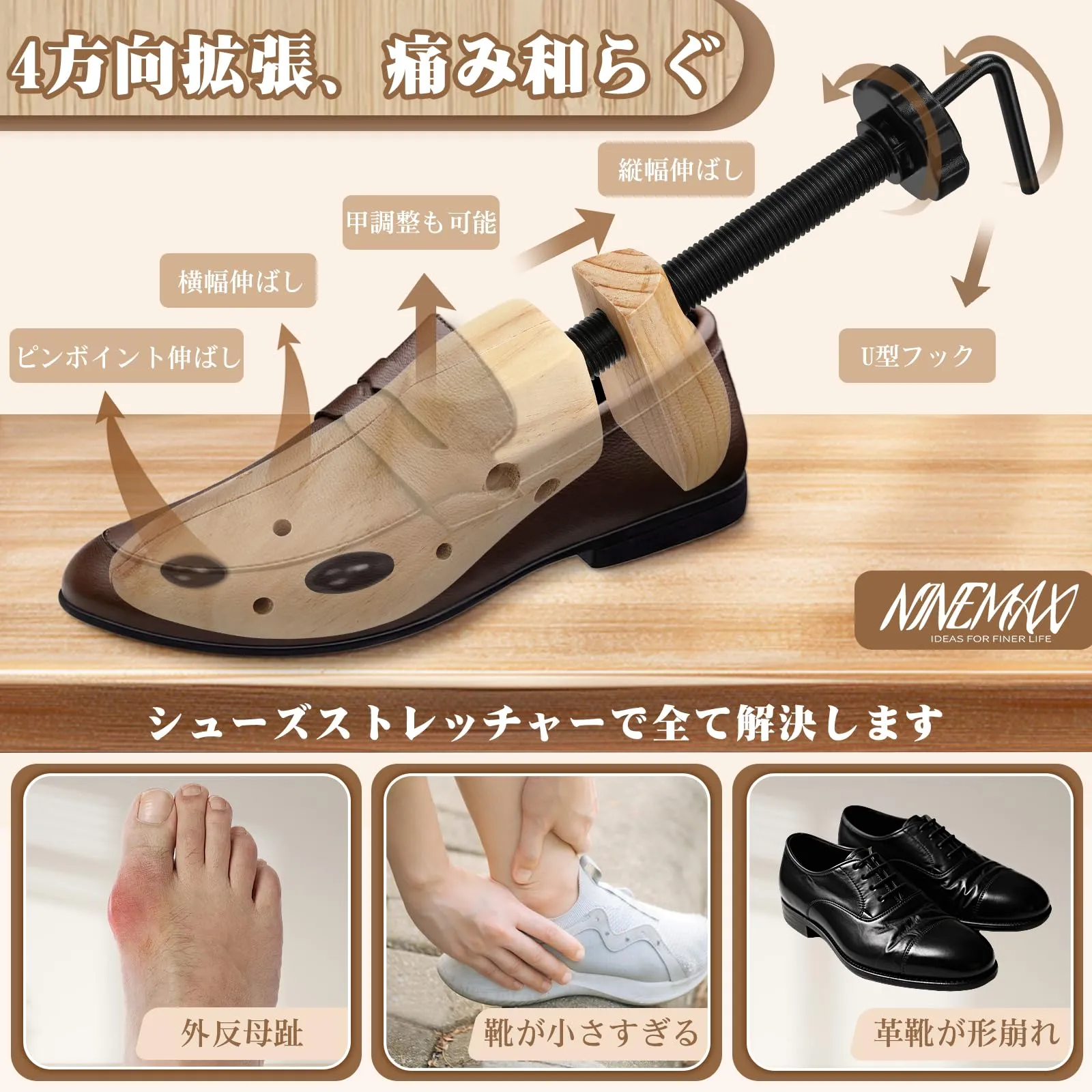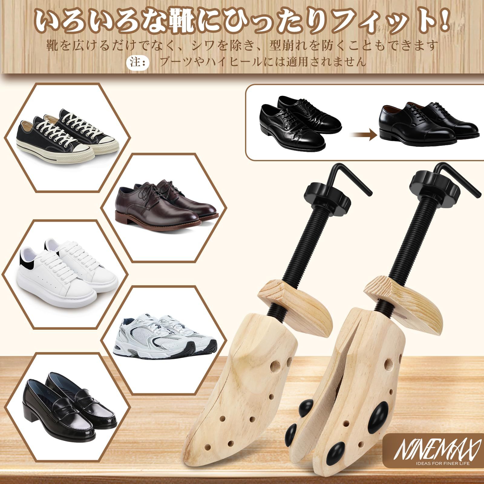 【型崩れ防止 & シワ伸ばし】NINEMAXシューズ ストレッチャーは、革靴の本来の形を保つ役割を果たします。甲部分はなだらかなカーブで厚みがあり、靴広げる道具を使用することで形状を矯正し、靴のシワを伸ばして長持ちさせます。特に革靴は、甲部分に横ジワが入ったり、曲がったりしやすいため、型崩れ防止にはシューズストレッチャー メンズが欠かせません。この 靴伸ばし道具は靴の寿命を延ばすのに最適なアイテムです。