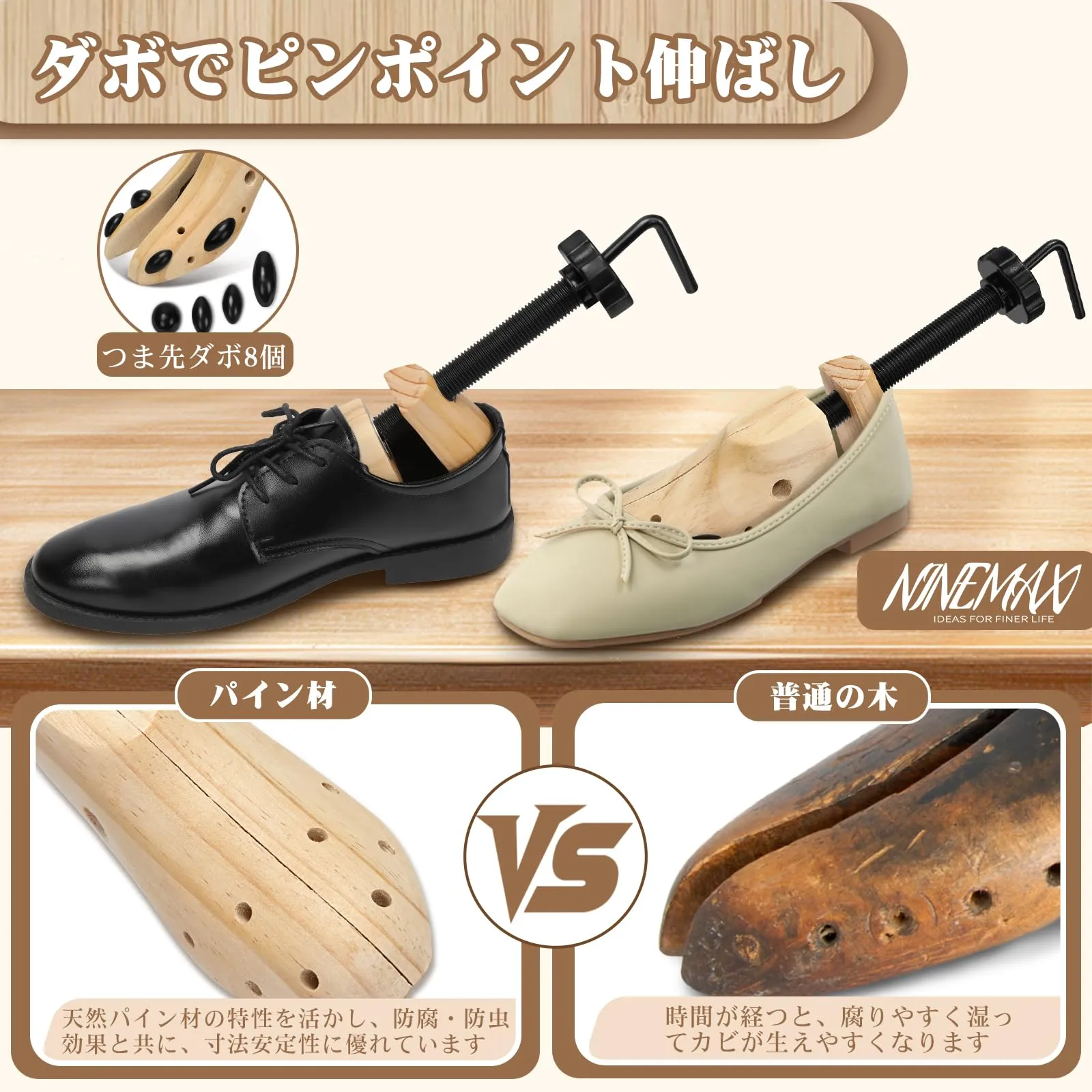 【高品質パイン材使用】耐久性抜群の木製シューズストレッチャー;天然パイン材を使用した高品質な靴サイズ伸ばし道具。腐りにくく、虫がつきにくい特性を持ち、耐久性と寸法安定性に優れています。大切な靴を傷めることなく、長期間使用可能です。