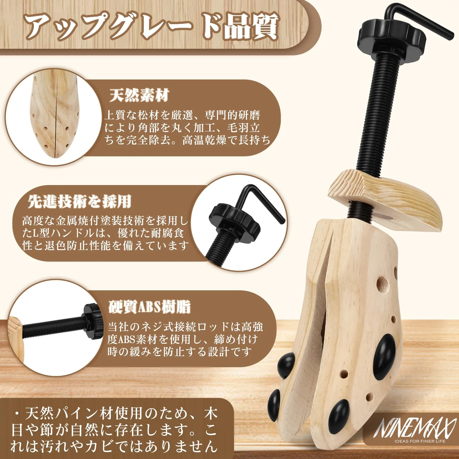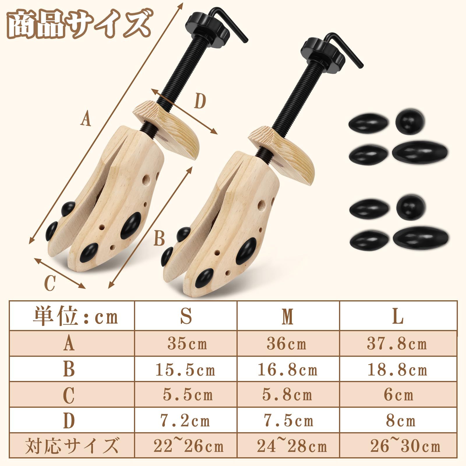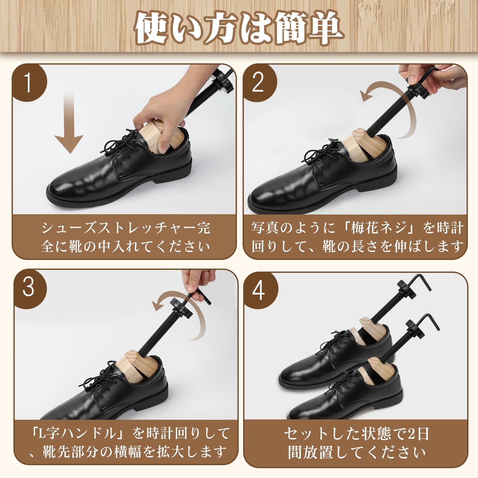 【使用上の注意】長持ちさせるためのお手入れ方法:木製シューストレッチャーの性能を維持するため、直射日光を避け、涼しい場所で保管してください。天然素材のため、自然な節や木目が存在しますが、これは汚れやカビではありません。適切なケアで長くご利用いただけます。